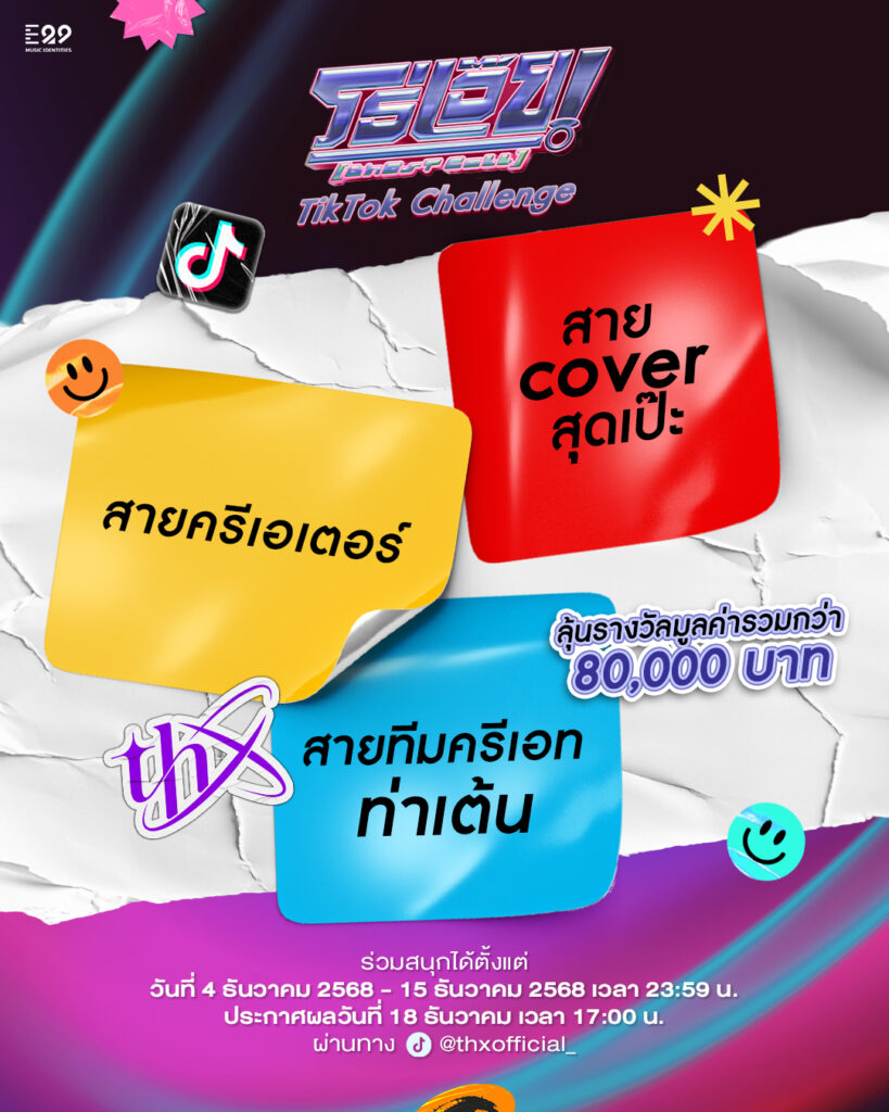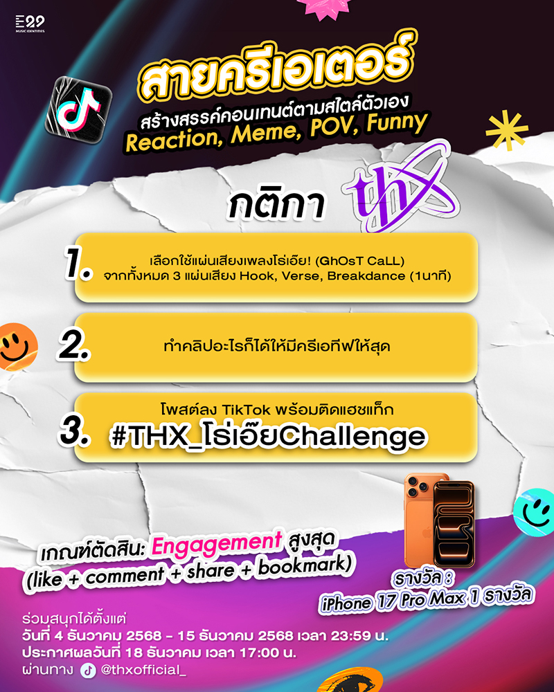 THX “โธ่เอ๊ย! TikTok Challenge” เริ่มแล้ว! จะสายเต้น สายเล่น หรือสายทีม แค่ใช้แผ่นเสียงเพลงโธ่เอ๊ย! (GhOsT CaLL) แล้วไปทำคลิปสนุกๆ บน TikTok ได้เลย มีสิทธิ์ลุ้นเป็นเจ้าของ iPhone 17 Pro Max และ เงินรางวัลรวมมูลค่ากว่า 85,212 บาท!