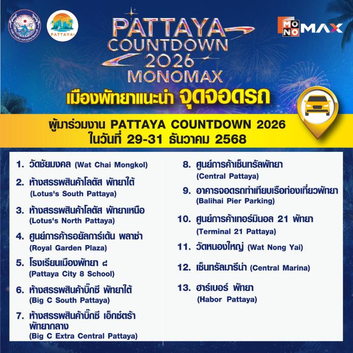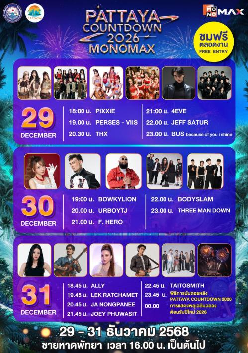 จากนั้นเข้าสู่ช่วงไฮไลต์หลักของเทศกาลกับงาน “PATTAYA COUNTDOWN 2026 MONOMAX” ซึ่งจัดขึ้นระหว่างวันที่ 29–31 ธันวาคม 2568 พบกับทัพศิลปินระดับท็อปที่ขนความสนุกมาแบบจัดเต็มตลอดทั้ง 3 วัน ก่อนสัมผัสไฮไลต์การแสดงแสงสีสุดตระการตา ปิดท้ายค่ำคืนส่งท้ายปีด้วยการแสดง พลุและโดรนกว่า 800 ลำ สร้างภาพจำสุดอลังการเหนืออ่าวพัทยา พร้อมโซนบูธอาหารเลิศรสและสินค้าจากเหล่าดารา คนดัง อาทิ จริยา, น้อย โพธิ์งาม, จุ๊บแจง วิมลพันธ์, หมอก้อง สรวิชญ์, อุ๊บ วิริยะ, F.HERO และอีกมากมาย ช่วยเพิ่มสีสันและเติมเต็มบรรยากาศให้เทศกาลปีนี้คึกคัก สนุกสนานตลอดทั้งงาน