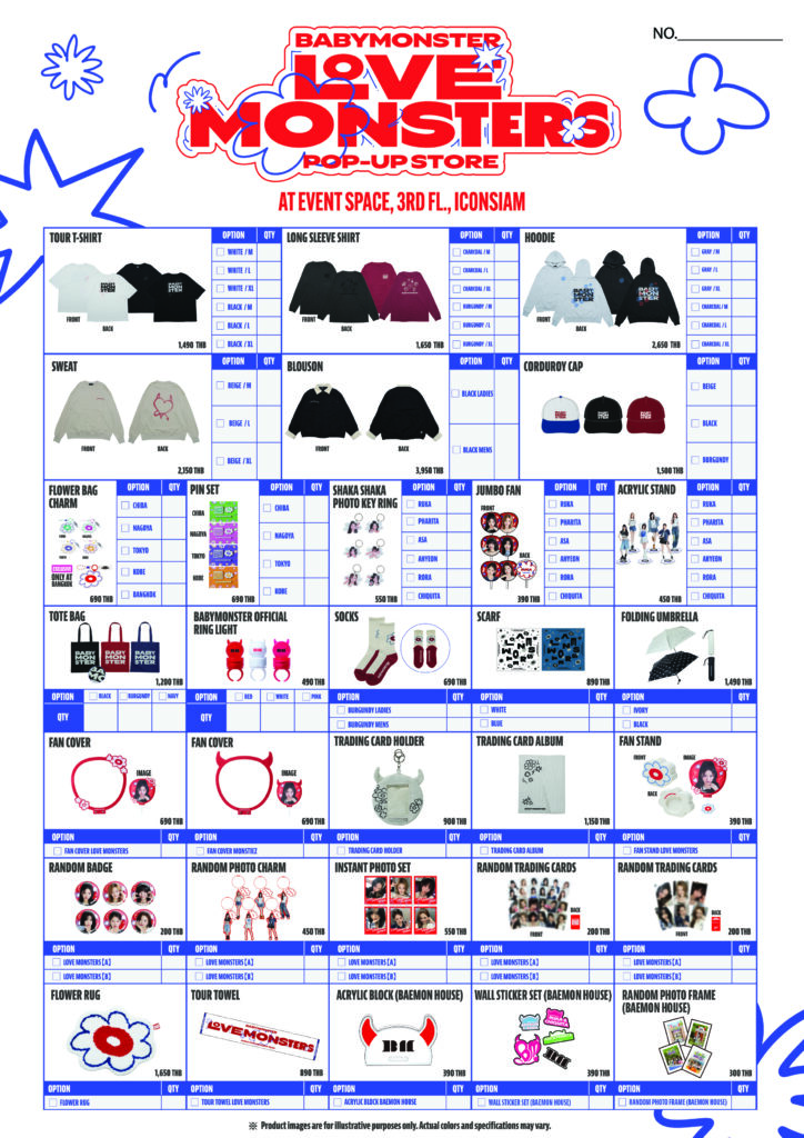 ความพิเศษที่หาไม่ได้จากที่อื่นคือการยกขบวนสินค้าคอลเลกชัน BABYMONSTER “LOVE MONSTERS” ASIA FAN CONCERT มาให้เลือกหลากหลายรายการ ทั้ง พัดเชียร์, ชุดรูปโพลารอยด์, ซองใส่โฟโต้การ์ด, สแตนดี้, เข็มกลัด รวมถึงสินค้าไลฟ์สไตล์ต่าง ๆ จาก BABYMONSTER ไม่ว่าจะเป็นเสื้อยืด, เสื้อฮู้ดดี้, หมวกปักโลโก้, ผ้าพันคอ, กระเป๋าผ้า และพวงกุญแจลายพิเศษที่วางจำหน่ายเฉพาะที่กรุงเทพฯ เท่านั้น