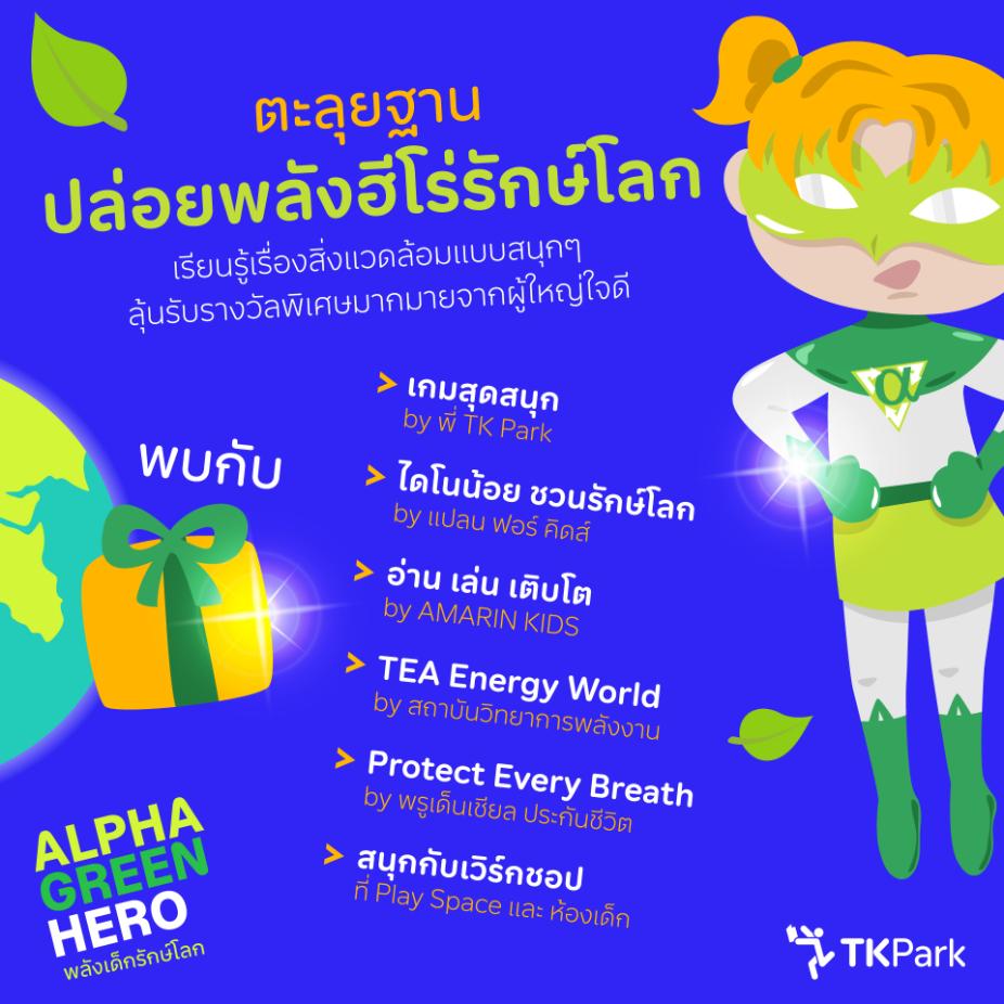 TK Park จึงขอเชิญชวนเหล่า “Alpha Green Hero” หรือเด็ก ๆ รุ่นใหม่ที่มีหัวใจรักษ์โลก มาร่วมผนึกกำลังปฏิบัติภารกิจกอบกู้โลก ด้วยการเรียนรู้ที่จะปรับเปลี่ยนพฤติกรรมในชีวิตประจำวัน และเฝ้าระวังไม่ให้มีการทำลายธรรมชาติซ้ำเติม เพื่อคืนความสมดุลให้กับโลกใบนี้อีกครั้ง
