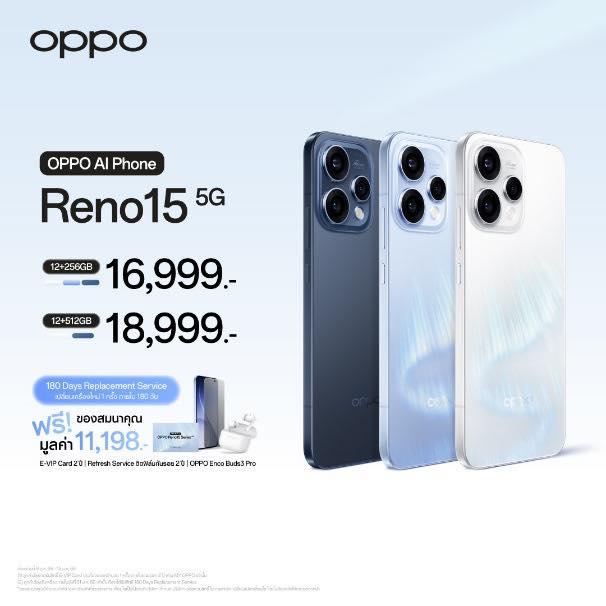 - OPPO Reno15 5G มีให้เลือก 3 สี ได้แก่ สีฟ้า Aurora Blue, สีน้ำเงิน Twilight Blue และสีชมพู Afterglow Pink และมาพร้อม 2 ความจุ ได้แก่ OPPO Reno15 5G (12+256GB) และ OPPO Reno15 5G (12+512GB) วางจำหน่ายในราคาเริ่มต้น 16,999 บาท