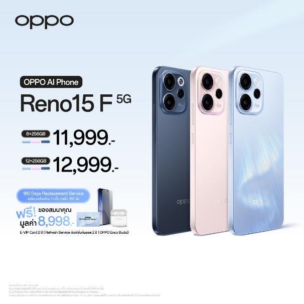 - OPPO Reno15 F 5G มีให้เลือก 3 สี ได้แก่ สีขาว Aurora White, สีฟ้า Aurora Blue และสีน้ำเงิน Twilight Blue และมาพร้อม 2 ความจุ ได้แก่ OPPO Reno15 F 5G (8+256GB) และ OPPO Reno15 F 5G (12+256GB) วางจำหน่ายในราคาเริ่มต้น 11,999 บาท