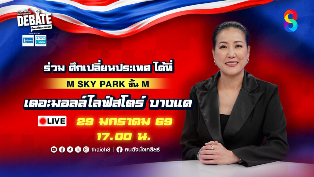 การดีเบตครั้งนี้จะมุ่งเน้นการ “ถามแทนใจชาวบ้าน” และ “เคลียร์นโยบายสดๆ บนเวที” ด้วยบรรยากาศที่ดุเดือดและตรงไปตรงมา เพื่อกะเทาะเปลือกแผนงานของแต่ละพรรคการเมืองให้ชัดเจนที่สุด โดยมีผู้ชมทั่วประเทศเป็นผู้ตัดสินใจหลักในการเลือกผู้นำ เตรียมพบกับปรากฏการณ์“ศึกเปลี่ยนประเทศ” พร้อมกัน ในวันพฤหัสบดีที่ 29 มกราคม 2569 เวลา 17.00 น. เป็นต้นไป ณ M SKY PARK ชั้น M เดอะมอลล์ ไลฟ์สโตร์ บางแค ทางสถานีโทรทัศน์ช่อง 8 กดหมายเลข 27 และติดตามข่าวออนไลน์ช่อง 8 ในทุกช่องทาง (Facebook, YouTube, TikTok, X) ศึกเลือกตั้งครั้งนี้เรามาลุยไปด้วยกัน เพราะทุกเสียงของคุณคือพลังสำคัญที่จะเปลี่ยนอนาคตประเทศไทยอย่างแท้จริง