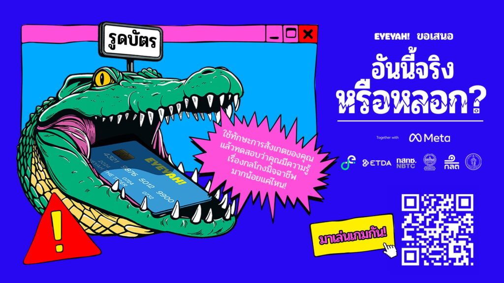 ศึกษาข้อมูลเพิ่มเติมเกี่ยวกับแคมเปญ “Is This Legit?” (อันนี้จริงหรือหลอก?) จาก Meta ร่วมกับกรุงเทพมหานคร (กทม.) กระทรวงดิจิทัลเพื่อเศรษฐกิจและสังคม (ดีอี) กองบัญชาการตำรวจนครบาล (บช.น.) คณะกรรมการกิจการกระจายเสียง กิจการโทรทัศน์ และกิจการโทรคมนาคมแห่งชาติ (กสทช.) สำนักงานพัฒนาธุรกรรมทางอิเล็กทรอนิกส์ (สพธอ.) หรือ เอ็ตด้า และสำนักงานคณะกรรมการกำกับหลักทรัพย์และตลาดหลักทรัพย์ (ก.ล.ต.) เพื่อเรียนรู้วิธีการระบุกลโกงของมิจฉาชีพได้โดยเยี่ยมชมเว็บไซต์ https://th.isthislegit.eyeyah.com/ หรือเข้าถึงผ่านลิงก์ QR ด้านล่างเพื่อทดลองเล่นเกมอินเทอร์แอคทีฟ และติดตามเพจ https://www.facebook.com/MetaTH และเพจกรุงเทพมหานคร https://www.facebook.com/bangkokbma เพื่อรับข้อมูลอัพเดตอย่างต่อเนื่องเกี่ยวกับวิธีที่จะช่วยให้ปลอดภัยจากการหลอกลวงทางออนไลน์