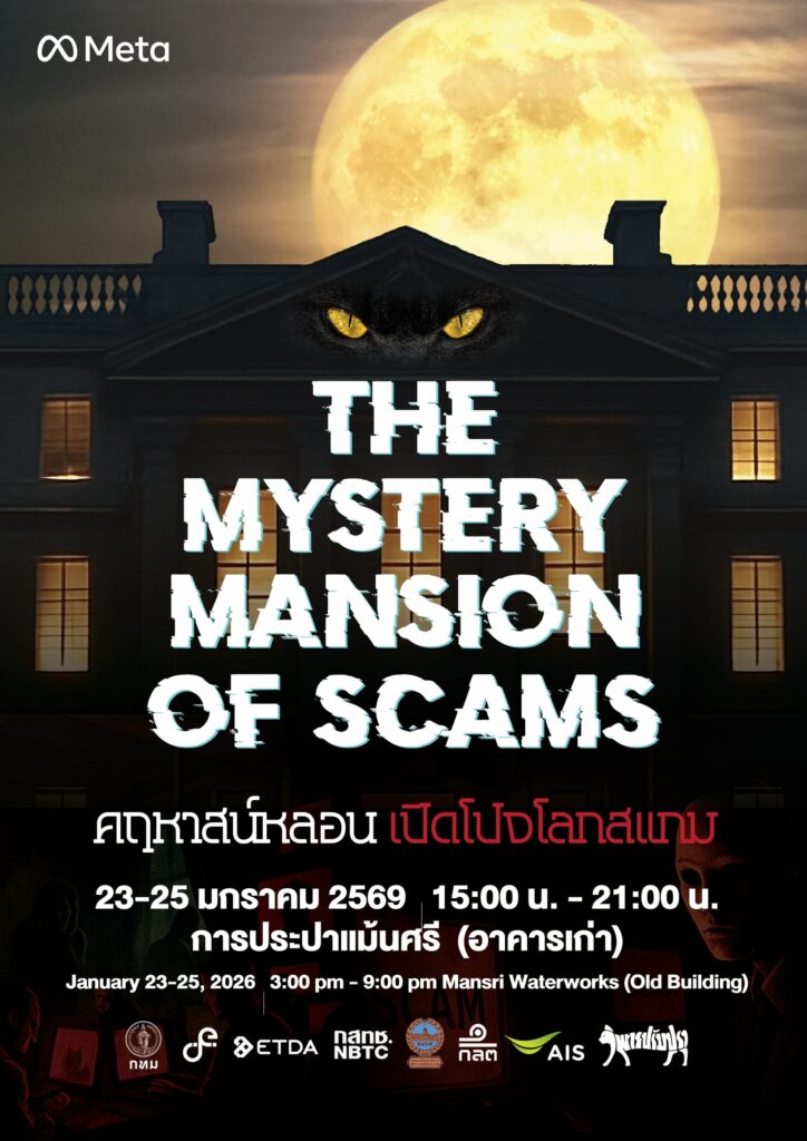 Meta เตรียมเปิดประสบการณ์แนวเกมไขปริศนาสุดอิมเมอร์ซีฟ The Mystery Mansion of Scams: คฤหาสน์หลอน เปิดโปงโลกสแกม ในวันที่ 23-25 มกราคม 2569 ณ การประปาแม้นศรี (หลังเก่า) ผ่านความร่วมมือกับ กรุงเทพมหานคร (กทม.) กระทรวงดิจิทัลเพื่อเศรษฐกิจและสังคม (ดีอี) กองบัญชาการตำรวจนครบาล (บช.น.) สำนักงานพัฒนาธุรกรรมทางอิเล็กทรอนิกส์ (สพธอ.) สำนักงานคณะกรรมการกำกับหลักทรัพย์และตลาดหลักทรัพย์ (ก.ล.ต.) และสำนักงานคณะกรรมการกิจการกระจายเสียง กิจการโทรทัศน์ และกิจการโทรคมนาคมแห่งชาติ (กสทช.) ส่วนหนึ่งของแคมเปญ “Is This Legit?” (อันนี้จริงหรือหลอก?) ที่จะเปลี่ยนการสร้างเสริมความรู้เท่าทันกลโกงออนไลน์แบบเดิมๆ ให้เป็นประสบการณ์ที่สามารถมีส่วนร่วมได้ด้วยตนเอง มอบความตื่นเต้นท้าทาย และเสริมแกร่งภูมิคุ้มกันและการตระหนักรู้และให้ความรู้แก่ประชาชนเกี่ยวกับกลโกงออนไลน์ไปในขณะเดียวกัน’