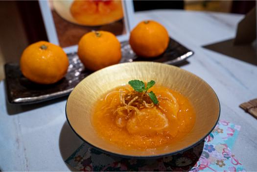 5. Nanki Mikan Trio เติมความสดชื่นปิดท้ายมื้ออาหารด้วยรสชาติหวานอมเปรี้ยวชุ่มฉ่ำอันเป็นเอกลักษณ์ของ “ส้มนันคิ” ผลไม้ขึ้นชื่อของจังหวัดมิเอะ ที่ปลูกบนภูเขาที่หันหน้ารับลมทะเลและอุดมด้วยแร่ธาตุตามธรรมชาติ จึงให้รสชาติหวานฉ่ำเข้มข้นเป็นพิเศษในช่วงฤดูหนาว (ช่วงเดือนธันวาคม – มกราคม) โดยนำมารังสรรค์เป็นเมนูของหวานที่มีเนื้อส้ม 3 สไตล์ในจานเดียว