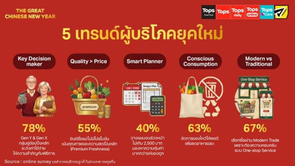 และในปีนี้ท็อปส์ยังพบเทรนด์พฤติกรรมผู้บริโภคช่วงตรุษจีนที่น่าสนใจจากการจัดทำผลสำรวจอินไซต์แนวโน้มการจับจ่ายช่วงเทศกาลตรุษจีนปี 2569 ของลูกค้าท็อปส์ ผ่านช่องทาง LINE TOPS Thailand และ Personal Shopper พบว่า