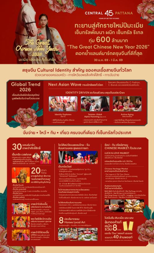 บริษัท เซ็นทรัลพัฒนา จำกัด (มหาชน) ผู้นำเบอร์หนึ่งอสังหาริมทรัพย์ไทยเพื่อความยั่งยืน ผนึกกำลังเซ็นทรัล รีเทล ต้อนรับสู่ศักราชใหม่ ฉลองเทศกาลตรุษจีนปีมะเมียมหามงคล ทุ่มงบ 600 ล้านบาท เปิดแคมเปญ “The Great Chinese New Year 2026” #มะเมียเฮงเฮงที่เซ็นทรัล ตอกย้ำแลนด์มาร์กฉลองตรุษจีนที่ดีที่สุด จับจ่าย-ไหว้-กิน-เที่ยว ครบจบในที่เดียว เดินหน้าอัดอีเวนต์และโปรโมชั่นที่ตอบโจทย์ไลฟ์สไตล์นักช้อปยุคใหม่ทุกเจเนอเรชัน บูสต์พลังจับจ่าย กระตุ้นเศรษฐกิจ-การท่องเที่ยว สร้างแม็กเน็ตดึงนักท่องเที่ยวช่วงไตรมาสแรกของปี เริ่ม 30 ม.ค. 69 – 1 มี.ค. 69 ที่ศูนย์การค้าและร้านค้าในเครือเซ็นทรัล รีเทล กว่า 3,000 แห่งและ เอสพละนาด รัชดา