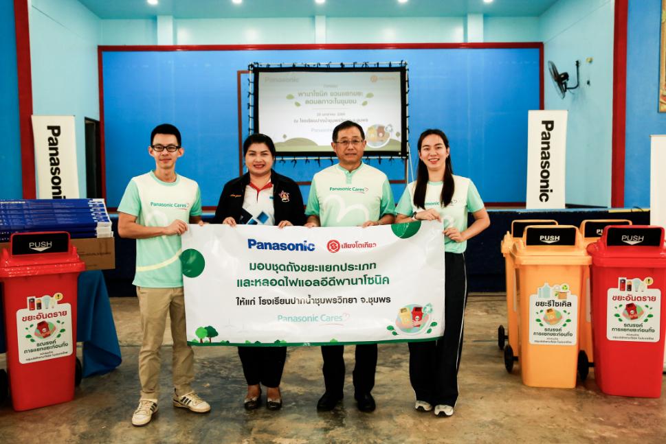 ล่าสุด กลุ่มบริษัทพานาโซนิคในประเทศไทย ร่วมกับ บริษัท เสียงโตเกียว จำกัด สานต่อกิจกรรม “พานาโซนิค ชวนแยกขยะ ลดมลภาวะในชุมชน” ลงพื้นที่จังหวัดชุมพร เพื่อสร้างจิตสำนึกด้านสิ่งแวดล้อมอย่างยั่งยืน โดยมี นายฮิเดคาสึ อิโตะ ซีอีโอ กลุ่มบริษัทพานาโซนิค ในประเทศไทย นำทีมพนักงานมอบชุดถังขยะแยกประเภท พร้อมหลอดไฟพานาโซนิค แอลอีดี ประหยัดพลังงาน จำนวน 100 หลอด ให้แก่โรงเรียนปากน้ำชุมพรวิทยา จังหวัดชุมพร เพื่อสนับสนุนการจัดการขยะอย่างถูกวิธี และเสริมสร้างสภาพแวดล้อมที่เอื้อต่อการเรียนรู้ ซึ่งมีนางสาวปวีณา นาคหกวิค ผู้อำนวยการ โรงเรียนปากน้ำชุมพรวิทย เป็นผู้รับมอบ และ นายเอกพงษ์ เตชะวงศ์ถาวร กรรมการผู้จัดการ บริษัท เสียงโตเกียว จำกัด ร่วมเป็นสักขีพยาน