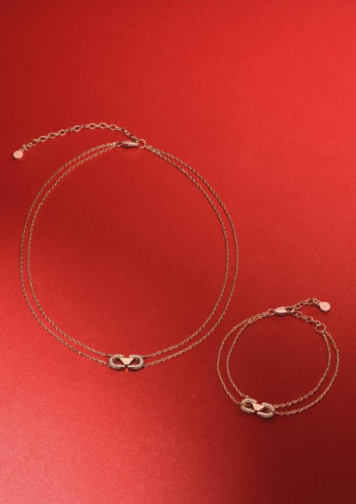 ส่วนนาฬิกาสำหรับสาว ๆ โดดเด่นด้วยหน้าปัดมุก (Mother-of-Pearl) บนตัวเรือนสีโรสโกลด์ ประดับด้านข้างด้วยดีไซน์รูปเกือกม้าฝังจิวเวลรี จับคู่กับสายหนังจระเข้สีเบอร์กันดี มอบลุคที่มีเสน่ห์แบบไร้กาลเวลา เสริมด้วยสร้อยคอและกำไลข้อมือสีโรสโกลด์ดีไซน์โซ่สองชั้น เพิ่มกลิ่นอายแห่งความเฉลิมฉลองอย่างมีระดับ