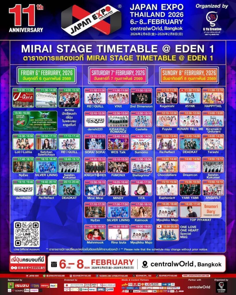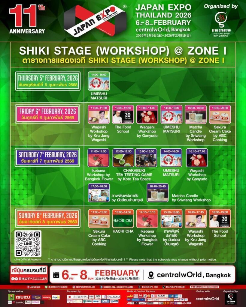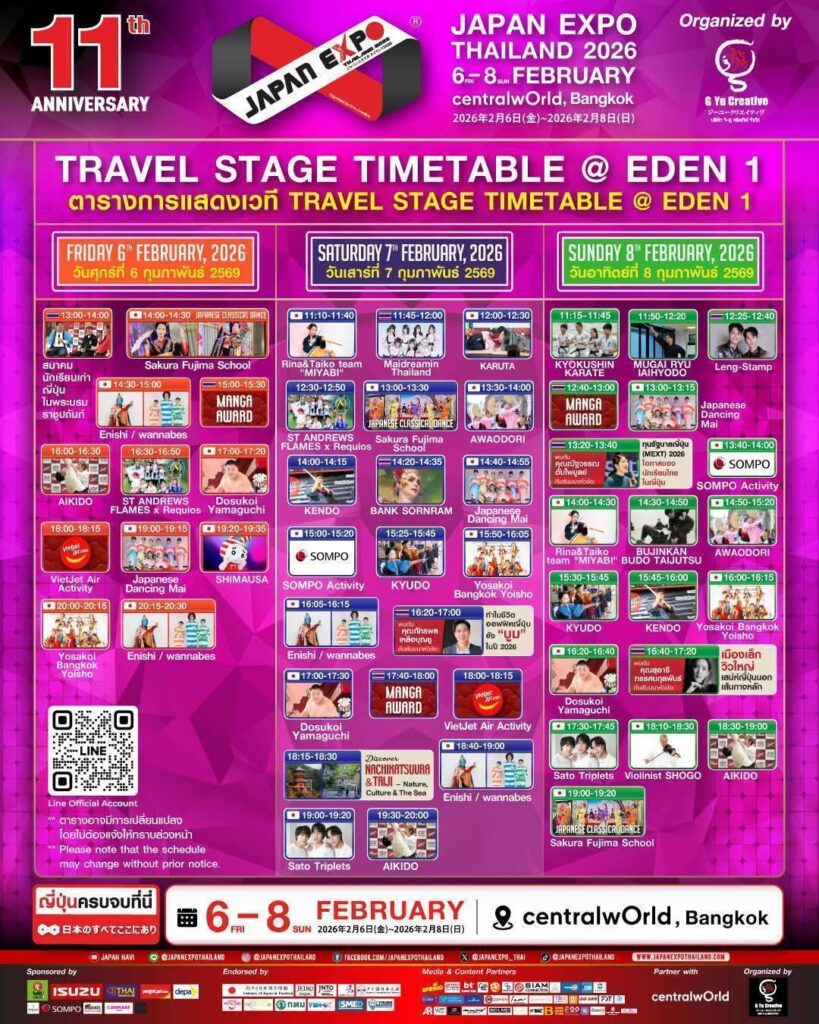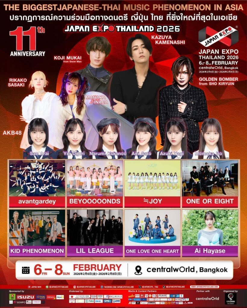 เตรียมนับถอยหลัง กับมหกรรมญี่ปุ่นที่ยิ่งใหญ่ที่สุดในเอเชีย JAPAN EXPO THAILAND 2026 ฉลองครบรอบปีที่ 11 สุดอลังการงานสร้าง ภายใต้ธีม ‘Japan Thai United as One’ โดยความร่วมมือระหว่าง บริษัท จี–ยู ครีเอทีฟ จำกัด และเหล่าพันธมิตรภาครัฐ-เอกชน ที่รวมใจกันจัดงานฉลองอย่างยิ่งใหญ่ให้คุ้มค่าการรอคอย โดยมี บริษัท โออิชิ กรุ๊ป จำกัด (มหาชน), บริษัท ตรีเพชรอีซูซุเซลส์ จํากัด, บริษัท การบินไทย จำกัด (มหาชน), เวียตเจ็ทไทยแลนด์, สำนักงานส่งเสริมเศรษฐกิจดิจิทัล (DEPA), โรงแรม Sivatel, Mainichi Academic Group, บริษัท เอ็ม.เอส. ฮานาโซโน (ประเทศไทย) จำกัด, สถานเอกอัครราชทูตญี่ปุ่นประจำประเทศไทย, องค์การส่งเสริมการค้าต่างประเทศของญี่ปุ่น (JETRO), องค์การส่งเสริมการท่องเที่ยวแห่งประเทศญี่ปุ่น (JNTO), เจแปนฟาวด์เดชั่น, สมาคมญี่ปุ่นในประเทศไทย Japanese Association in Thailand, Amazing Thailand, Thailand Privilege, กรุงเทพมหานคร, YEN-D X, สถาบันพัฒนาวิสาหกิจขนาดกลางและขนาดย่อม (ISMED) และYoung Entrepreneurs Chamber of Commerce (YEC) ร่วมผนึกกำลังจัดงานมหกรรมญี่ปุ่นที่ยิ่งใหญ่ที่สุดในเอเชีย ซึ่งจะจัดขึ้นระหว่างวันศุกร์ที่ 6 – วันอาทิตย์ที่ 8 กุมภาพันธ์ 2569 เวลา 10:00 – 21:00 น. ณ ศูนย์การค้าเซ็นทรัลเวิลด์