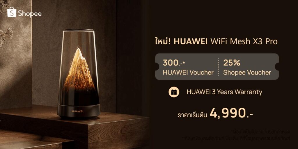 HUAWEI WiFi Mesh X3 Pro วางจำหน่ายใน Shopee ตั้งแต่วันที่ 6 กุมภาพันธ์ 2569 ลูกค้า Early Bird ที่สั่งซื้อภายในวันแรกรับโปร ผ่อน 0% นานสูงสุด 5 เดือน พร้อมโค้ดส่วนลดเพิ่มจากหัวเว่ย 300 บาท พร้อมสิทธิประโยชน์การรับประกัน HUAWEI 3 years Warranty มูลค่า 5,997 บาท โดยลูกค้าสามารถชอปเพื่อท่องเน็ตครอบคลุมพื้นที่ได้ทั่วทั้งบ้านด้วยแพ็คเกจเราเตอร์ในราคาพิเศษดังนี้