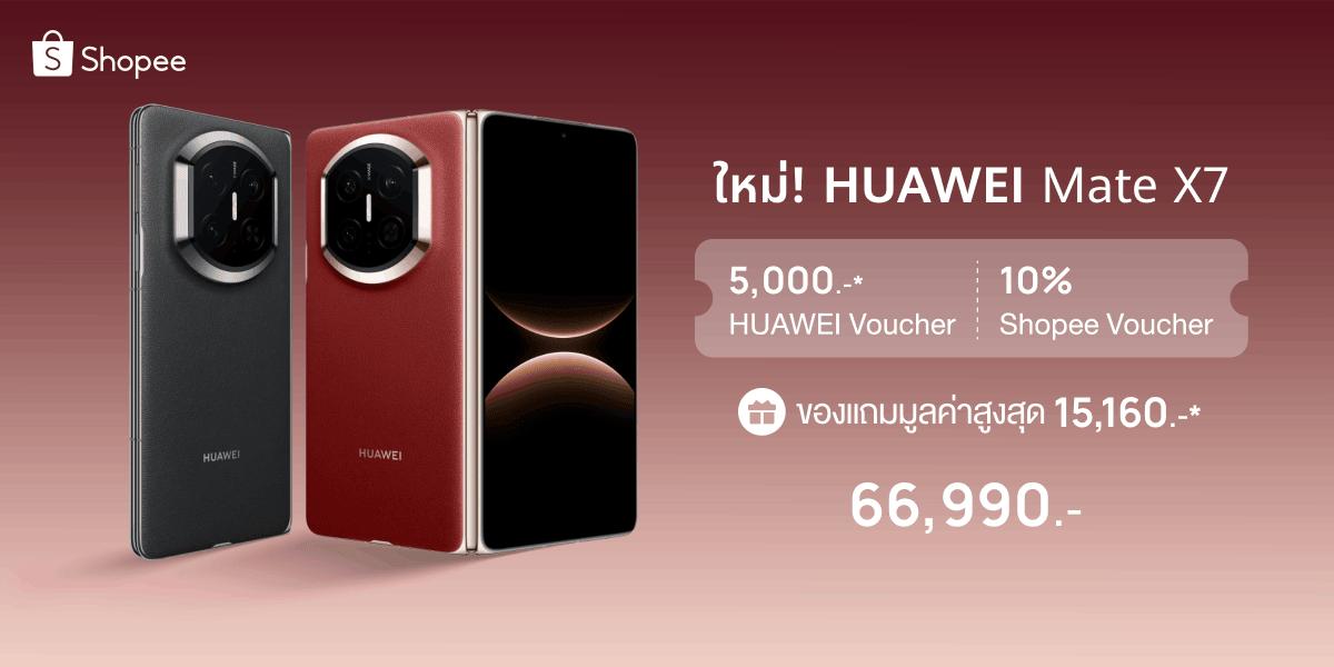 HUAWEI Mate X7 เปิดพรีออเดอร์บน Shopee ตั้งแต่ 6 กุมภาพันธ์ 2569 – 13 กุมภาพันธ์ 2569 ลูกค้าสามารถซื้อโดยผ่อน 0% นานสูงสุด 5 เดือน พร้อมรับโค้ดส่วนลดจากหัวเว่ย 5,000 บาท พร้อมของสมนาคุณสุดพิเศษ HUAWEI WATCH GT5 (สุ่มแบบ) มุลค่า 6,990 บาท HUAWEI SuperCharge 66W Adapter มูลค่า 1,690 บาท HUAWEI Rotating Stand Aramid Fiber Case มุลค่า 1,490 บาท รวมไปถึงการรับประกันซ่อมหน้าจอ 1 ครั้งต่อปีมูลค่า 4,990 บาท ดูเงื่อนไขของบริษัทได้ที่นี่