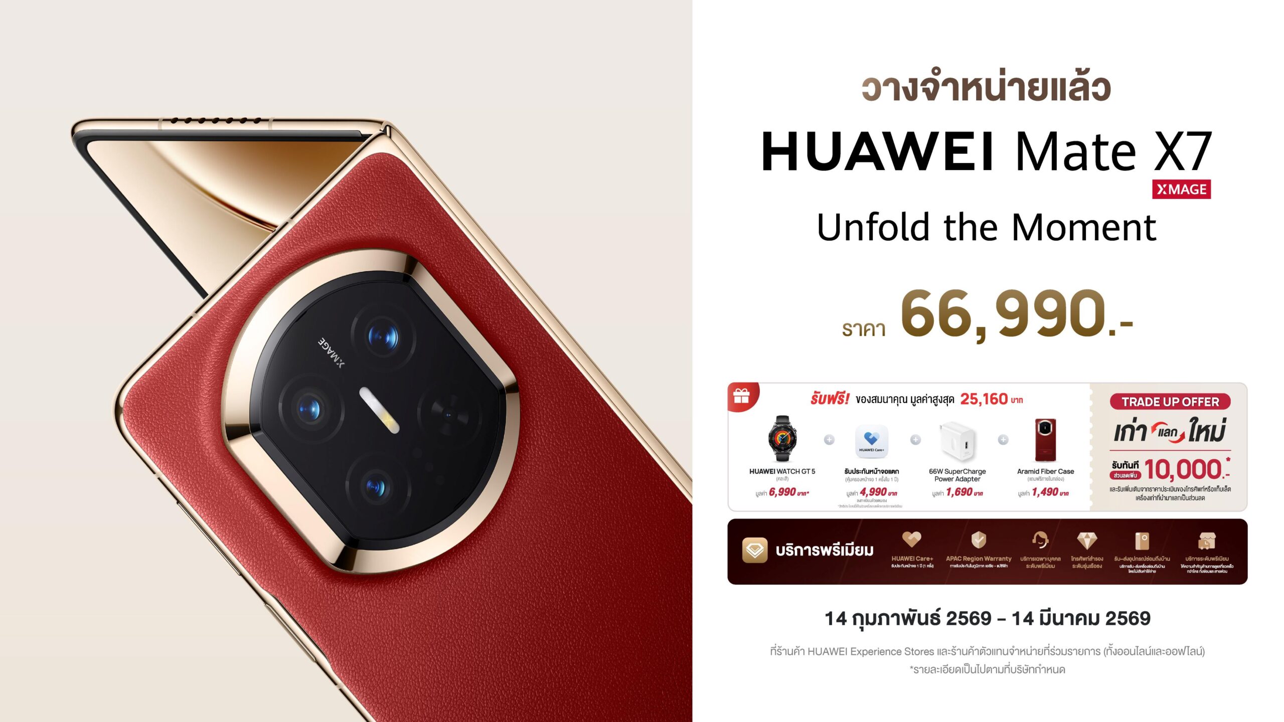 สิ้นสุดการรอคอย! หัวเว่ย คอนซูมเมอร์ บิสสิเนส กรุ๊ป (ประเทศไทย) ประกาศวางจำหน่าย HUAWEI Mate X7 สมาร์ทโฟนจอพับระดับเรือธงที่สุดของความแกร่ง มาพร้อมเทคโนโลยีกล้องคมชัดสมจริงเหมือนตาเห็น โดยสามารถเป็นเจ้าของได้แล้ววันนี้ที่ราคา 66,990 บาท รับของสมนาคุณมูลค่าสูงสุด 25,160 บาท เมื่อซื้อสินค้าระหว่างวันที่ 14 กุมภาพันธ์ 2569 ถึงวันที่ 14 มีนาคม 2569 พร้อมกันนี้ หัวเว่ยยังปล่อยโปรโมชันรับเทศกาล วาเลนไทน์ ให้จับจองผลิตภัณฑ์สมาร์ทดีไวซ์อีกมากมายพร้อมรับส่วนลดสุดคุ้ม ระหว่างวันที่ 1 กุมภาพันธ์ 2569 ถึง 28 กุมภาพันธ์ 2569