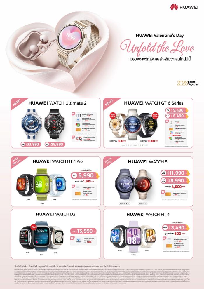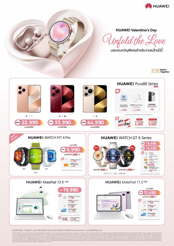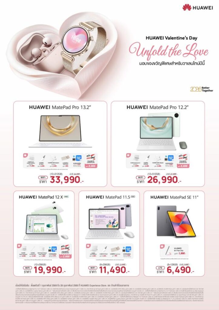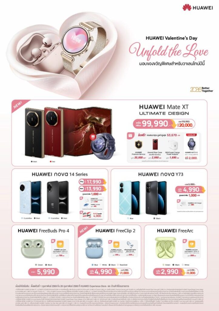 ใครที่มองหาของขวัญให้คนพิเศษ สามารถเลือกดูสมาร์ทดีไวซ์ต่างๆ ที่หัวเว่ยยกขบวนมาจัดโปรโมชันลดราคาพิเศษในช่วงเดือนแห่งความรัก เมื่อซื้อผ่านหน้าร้าน HUAWEI Experience Store และร้านค้าที่ร่วมรายการ ตั้งแต่วันที่ 1 กุมภาพันธ์ 2569 ถึงวันที่ 28 กุมภาพันธ์ 2569 (เงื่อนไขเป็นไปตามที่บริษัทฯ กำหนด) โดยมีรายละเอียดดังต่อไปนี้