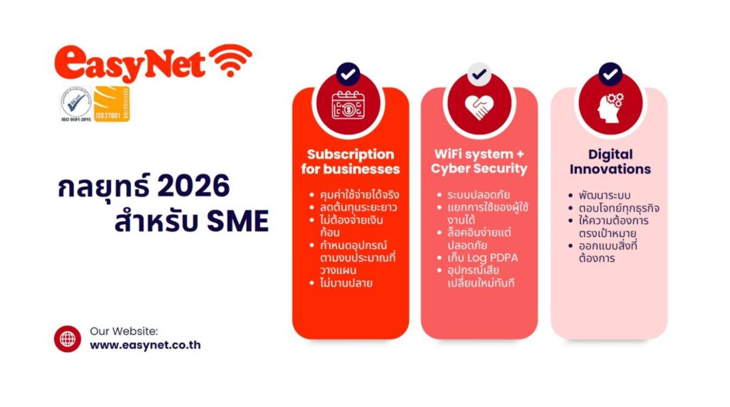 บริษัท อีซี่ เน็ต (ไทยแลนด์) จำกัด ผู้เชี่ยวชาญการด้านวางระบบ Network และ ไอที โซลูชันเต็มรูปแบบอย่างครบวงจรโดยได้การรับรองจาก ISO9001 : 2015 และ ISO27001 นำโดย นายโกวิท ธารีรัตนาวิบูลย์ ประธานเจ้าหน้าที่บริหาร พร้อมด้วยนางวาณา ธารีรัตนาวิบูลย์ ประธานเจ้าหน้าที่ฝ่ายการตลาด และนายพงศภัค ธารีรัตนาวิบูลย์ ประธานเจ้าหน้าที่ฝ่ายปฏิบัติการ จัดงานแถลงข่าว “เปิดกลยุทธ์ EasyNet 2026: เพื่อนคู่คิดทางเทคโนโลยีของ SME” มุ่งเป้าขับเคลื่อนเศรษฐกิจดิจิทัลของไทยผ่านโมเดล “เช่าระบบ WiFi พร้อมอุปกรณ์แบบครบวงจร” (WiFi as a Service) เพื่อทลายขีดจำกัดด้านงบประมาณและเพิ่มขีดความสามารถในการแข่งขันให้กับผู้ประกอบการทุกระดับ