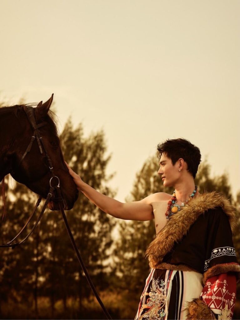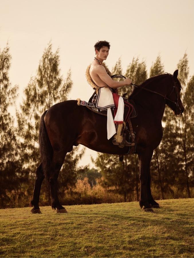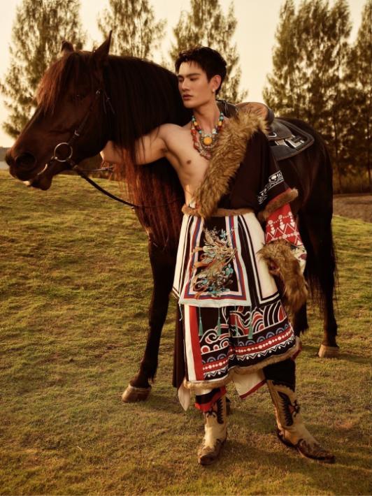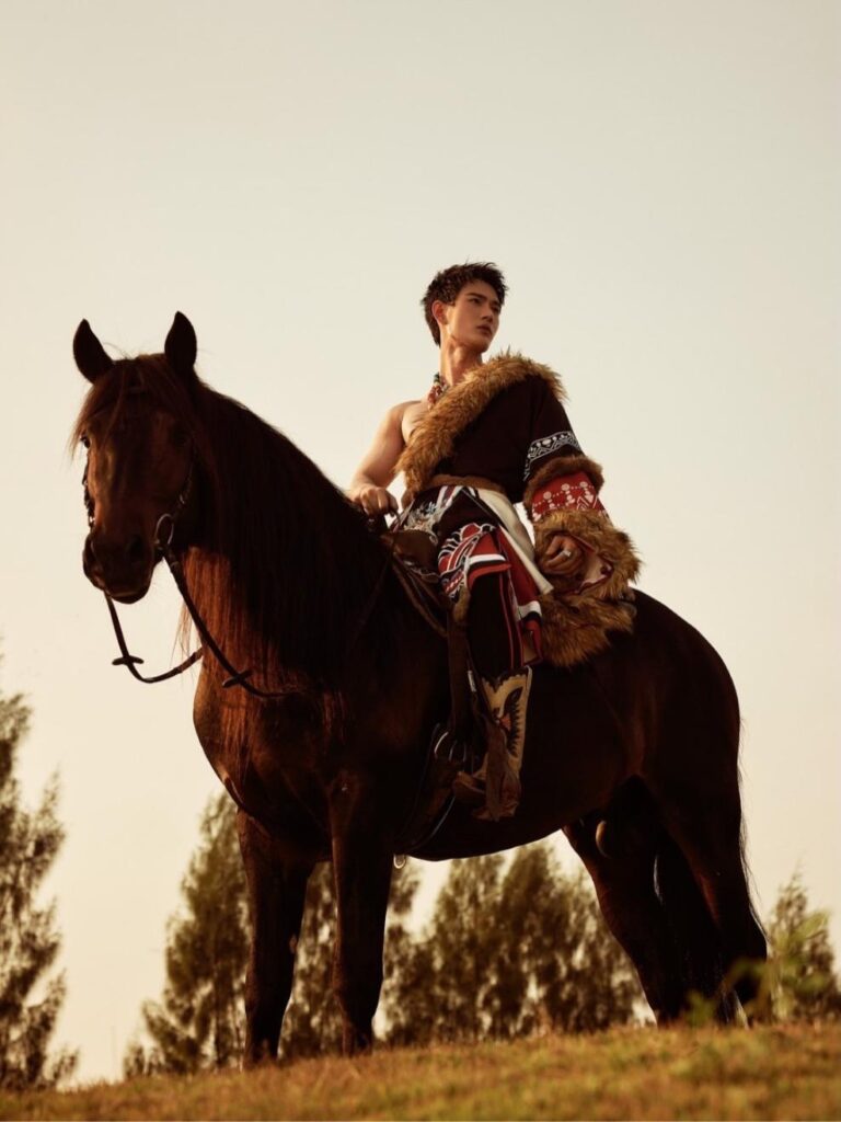 ลุคนี้พาเวลมาในสไตล์โบฮีเมียน-เอธนิก คลุมด้วยผ้าขนเฟอร์ โดดเด่นด้วยสร้อยลูกปัดสีสดชิ้นใหญ่ที่เพิ่มมิติความขลัง ผสานบรรยากาศทุ่งหญ้าและม้าสีน้ำตาลคู่ใจ ยิ่งขับภาพลักษณ์ “ปีม้า” ให้ชัดเจน ทั้งทรงพลัง อิสระ และเร่าร้อน