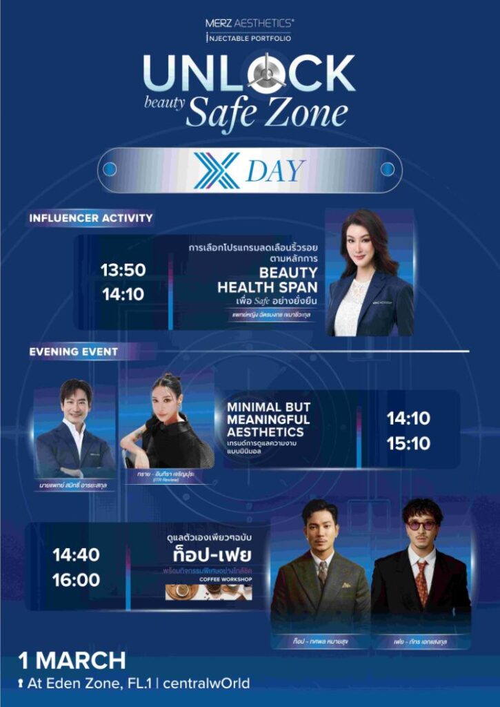 เตรียมตัวให้พร้อม แล้วไปกรี๊ดให้สุดเสียง! ในงาน “UNLOCK BEAUTY SAFE ZONE” ได้ตั้งแต่วันที่ 27 กุมภาพันธ์ – 1 มีนาคม 2569 ณ โซนอีเดน ชั้น 1 ศูนย์การค้าเซ็นทรัลเวิลด์ ติดตามรายละเอียดเพิ่มเติมได้ที่ Facebook: Merz Aesthetics Thailand และ Line OA @merzbeautyconnect