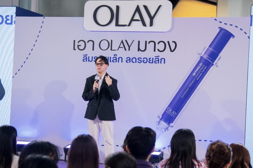 ภายในงานรายล้อมด้วยกิจกรรมหลากหลายจากโอเลย์ ไม่ว่าจะเป็น Wrinkle Check การทดลองผลิตภัณฑ์จริง การถ่ายภาพกับ Giant Product และ Photo Booth พร้อมพบกับ OLAY OVERNIGHT WRINKLE CONCENTRATE หรือ Olay ปากกาม่วงเก็บรอยลึก นวัตกรรมใหม่ล่าสุดจากโอเลย์ เซรั่มเรตินอลแต้มริ้วรอยเฉพาะจุดที่มาในรูปแบบปากกา พกพาง่าย สามารถใช้แต้มริ้วรอยที่เข้าถึงได้ยากอย่างแม่นยำ ทั้งบริเวณหน้าผาก ใต้ตา ตีนกา และร่องแก้ม อุดมด้วย Retinol 0.35% ช่วยผลัดเซลล์ผิวชั้นบน และ Signal peptides ช่วยเติมเต็มให้ผิวแลดูเด้งอิ่มฟูขึ้นจากภายใน การันตีผลลัพธ์จากผู้ใช้จริง 97% คอนเฟิร์มว่าหลังใช้ผลิตภัณฑ์อย่างต่อเนื่อง 28 วัน ริ้วรอยลึกสะสมแลดูลดเลือนอย่างเห็นได้ชัด** จนกลายเป็นจุดรวมตัวของแฟนโอเลย์และบิวตี้เลิฟเวอร์ทุกคนได้สัมผัสบรรยากาศที่ทั้งสนุก เข้าถึงง่าย และสะท้อนภาพลักษณ์ของการดูแลผิวที่ไม่จำเป็นต้องจริงจังจนเกินไป โดยได้รับเกียรติจาก คุณกฤษณพงศ์ สงวนปรางค์ Olay Brand Manager ร่วมต้อนรับสื่อมวลชนและแขกผู้มีเกียรติ พร้อมเผยวิสัยทัศน์ในการพัฒนานวัตกรรมดูแลริ้วรอยของ Olay ที่มุ่งตอบโจทย์การดูแลผิวอย่างตรงจุด และเข้ากับไลฟ์สไตล์ของผู้บริโภคยุคใหม่