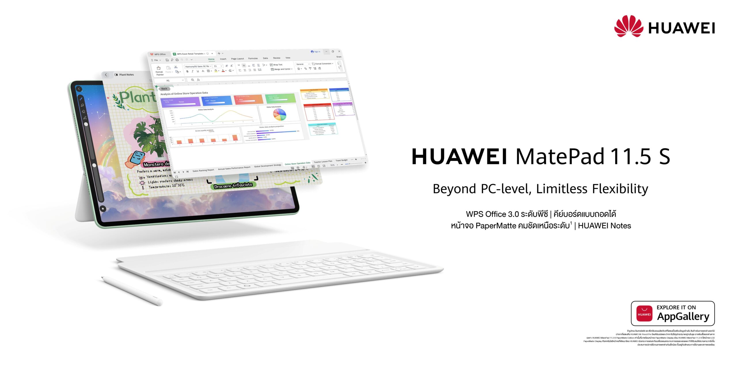 HUAWEI MatePad 11.5 S 2026 รุ่น Wi-Fi (12GB+256GB) จำหน่ายในราคาสุดคุ้มเพียง 16,990 บาท มีให้เลือก 2 สี ได้แก่ สี Green และสี Space Gray และพิเศษหากซื้อในช่วงโปรโมชั่น ระหว่างวันที่ 17 กุมภาพันธ์ 2569 – 24 กุมภาพันธ์ 2569 รับไปเลยประสบการณ์ PC-Like แบบครบเซ็ตในมูลค่ารวมทั้งหมด 20,230 บาท ได้แก่ HUAWEI Smart Keyboard มูลค่า 4,990 บาท, HUAWEI M-Pencil 3 มูลค่า 4,490 บาท, HUAWEI Bluetooth Mouse มูลค่า 1,490 บาท และ 40W SuperCharge Power Adapter มูลค่า 1,290 บาท นอกจากนี้ยังติดตั้งโปรแกรมให้ฟรี ได้แก่ WPS Office 3.0 มูลค่า 3,990 บาท, HUAWEI Notes มูลค่า 1,990 บาท และ GoPaint App มูลค่า 1,990 บาท พิเศษยิ่งกว่าสำหรับลูกค้าเก่าแลกใหม่ รับส่วนลด 2,000 บาท เพิ่มเติมจากราคาประเมิน สามารถสั่งซื้อได้ที่ HUAWEI Experience Store และร้านค้าที่ร่วมรายการทั้งออฟไลน์และออนไลน์ รวมถึง HUAWEI Store และร้านค้าอย่างเป็นทางการของหัวเว่ยบนแพลตฟอร์ม Lazada, Shopee และ TikTok Shop