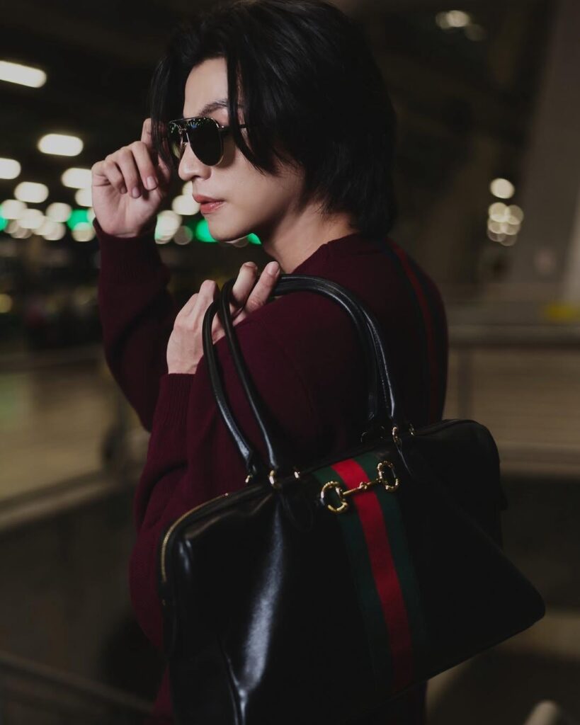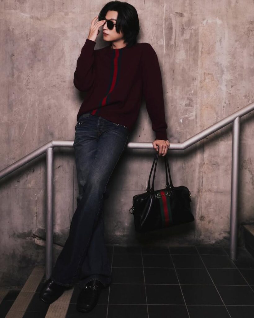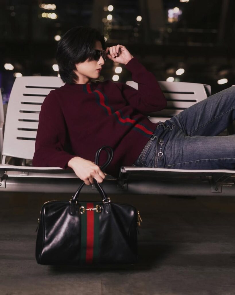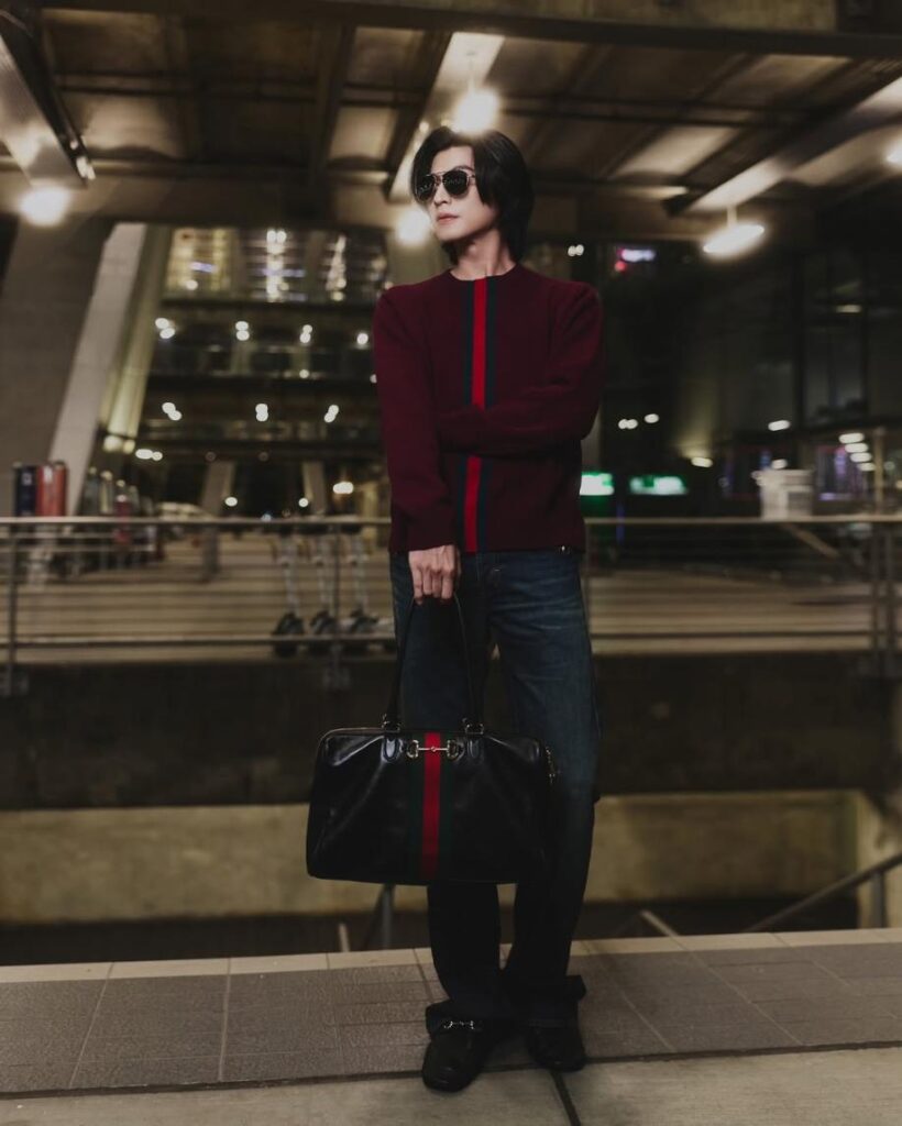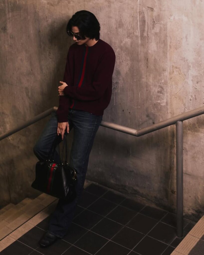 “กลัฟ–คณาวุฒิ” ปรากฏตัวด้วยลุคหล่อแกลม ในเสื้อสเวตเตอร์สีแดงบอร์โดผ้าวูลถักละเอียด ตกแต่งด้วย อินทาร์เซียแถบ Web สีเขียวและสีแดง จับคู่กับกางเกงผ้าฝ้ายเดนิมฟอกสีตกแต่งด้วยสัญลักษณ์ Horsebit จาก คอลเล็คชั่น Spring Summer 2026 เสริมลุคด้วยไอเท็มชิ้นเด่นกระเป๋ารุ่น Borsetto หนังนิ่มสีดำ โดดเด่นด้วยฮาร์ดแวร์รูปทรงตะขอปากม้าซึ่งเป็นรหัสสำคัญของแบรนด์ นำเสนอในซิลูเอตผ่อนคลายร่วมสมัย ปิดท้ายลุคด้วยรองเท้า Horsebit Loafer หนังสีดำ ดีไซน์โครงสร้างประณีตมอบความนุ่มสบายและยืดหยุ่นเป็นพิเศษ พร้อมแว่นกันแดดรูปทรง Aviator ถ่ายทอดเสน่ห์สมมง Brand Ambassador ตัวแทนหนึ่งเดียวจากประเทศไทยของ Gucci ได้อย่างสง่างาม