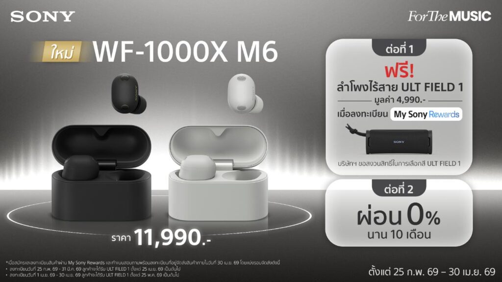 WF-1000XM6 พร้อมวางจำหน่ายอย่างเป็นทางการตั้งแต่วันที่ 25 กุมภาพันธ์ 2569 ในราคา 11,990 บาท โดยมีให้เลือกทั้งหมด 2 สี ได้แก่ สีดำ (Black) และสีแพลตตินัมซิลเวอร์ (Platinum Silver) พร้อมโปรโมชั่นพิเศษ รับฟรีลำโพงพกพาโซนี่ ULT FIELD 1 มูลค่า 4,990 บาท เมื่อซื้อหูฟัง WF-1000XM6 และลงทะเบียนรับประกันสินค้า My Sony ผ่านไลน์ @SonyThai พร้อมตอบแบบสอบถามที่จะได้รับทางอีเมลหลังการลงทะเบียนรับประกันสินค้าภายในวันเดียวกัน ตั้งแต่วันที่ 25 กุมภาพันธ์ 2569 – 30 เมษายน 2569