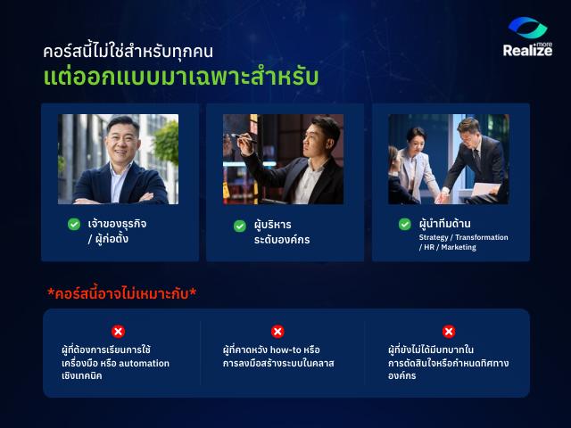 ด้วยประสบการณ์การเป็นผู้เชี่ยวชาญด้านกลยุทธ์ ข้อมูลที่ใช้ และสอน AI ให้กับบริษัทชั้นนำระดับประเทศมาแล้วกว่า 200 แบรนด์ มิ้น – อุกฤษฎ์ ผู้ก่อตั้งและผู้บริหารบริษัท Realize More Academyได้เน้นย้ำหัวใจสำคัญของการทรานส์ฟอร์มองค์กรว่า “เราไม่ได้เริ่มจากการ ‘สอนใช้เครื่องมือ’ แต่เราเริ่มจากการทำความเข้าใจปัญหาของผู้บริหารจริงๆ หลักสูตรนี้จะช่วยให้ผู้นำเห็นภาพเดียวกัน และตัดสินใจเรื่อง AI ได้อย่างมีทิศทาง ก่อนที่จะเริ่มลงทุนหรือขยายการใช้งานในองค์กร”