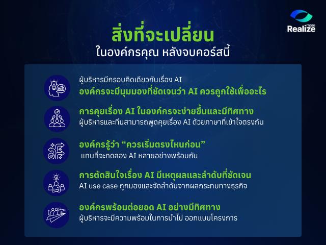 - เข้าใจภาพรวมการเปลี่ยนแปลงขององค์กรในยุค AI พร้อมเห็นโอกาส ความเสี่ยง และข้อจำกัดในบริบทธุรกิจจริง