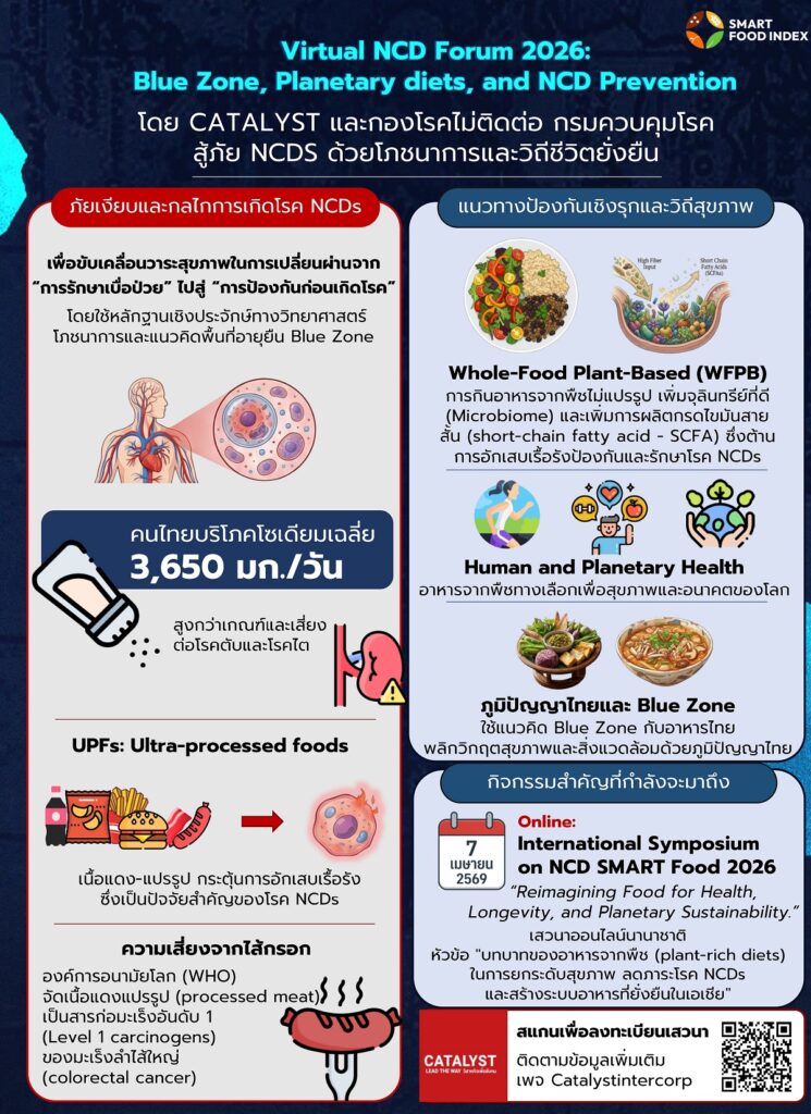 เพื่อยกระดับองค์ความรู้สู่การปฏิบัติอย่างเป็นระบบ และเปิดพื้นที่แลกเปลี่ยนองค์ความรู้เชิงลึกและสร้างเครือข่ายความร่วมมือระดับสากล CATALYST เตรียมจัดงานสัมมนาระดับนานาชาติ “International Symposium on NCD SMART Food 2026” ในวันที่ 7 เมษายน 2569 ซึ่งจะเป็นเวทีสำคัญในการอัปเดตข้อมูลวิจัยล่าสุด ผู้เชี่ยวชาญด้านสาธารณสุข โภชนาการ เวชศาสตร์ป้องกัน และภาคนโยบาย เพื่ออัปเดตสถานการณ์ล่าสุด งานวิจัยใหม่ แนวทางเวชศาสตร์ป้องกัน และนโยบายสาธารณสุขที่เกี่ยวข้องการป้องกัน NCD ที่มีประสิทธิภาพมากขึ้น