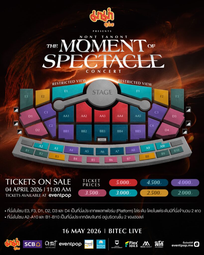 บัตรเปิดจำหน่าย วันเสาร์ที่ 4 เมษายน 2569 เวลา 11:00 น. ราคาบัตร 5,000 / 4,500 / 4,000 / 3,500 / 3,000 / 2,500 / 2,000 บาท ผ่านทาง Eventpop
