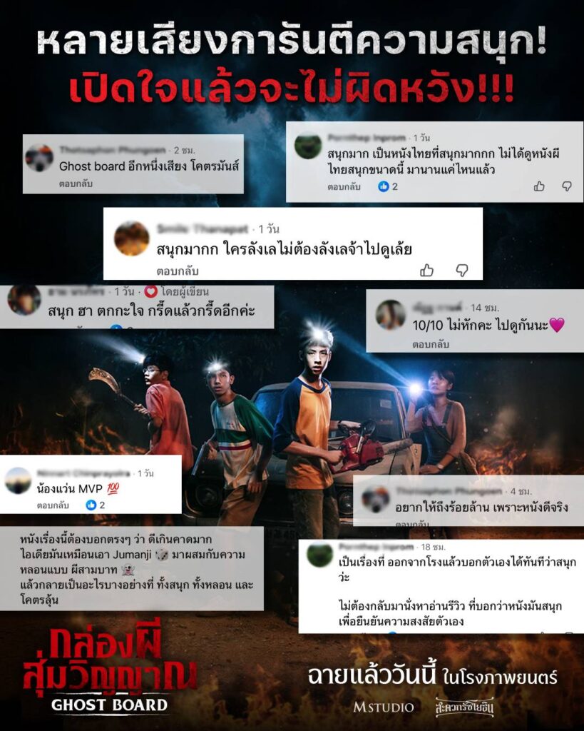 กลายเป็นกระแสพูดถึงอย่างต่อเนื่องในโลกออนไลน์ สำหรับภาพยนตร์สยองขวัญเรื่อง “Ghost Board กล่องผีสุ่มวิญญาณ” จาก M Studio และ สะดวกรัชโยธิน ที่หลังจากเข้าฉายในโรงภาพยนตร์ เสียงรีวิวจากผู้ชมจริงก็เริ่มหลั่งไหลออกมาอย่างคึกคัก พร้อมคำยืนยันจากคนดูจำนวนมากว่าเป็น “หนังผีที่สนุกเกินคาด” และเป็นอีกเรื่องที่ควรไปพิสูจน์ด้วยตัวเองในโรงภาพยนตร์