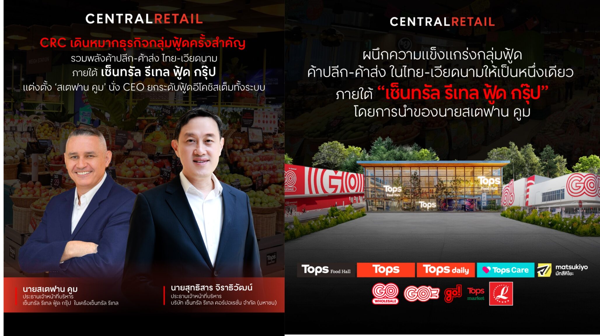 บริษัท เซ็นทรัล รีเทล คอร์ปอเรชั่น จำกัด (มหาชน) หรือ CRC ประกาศรวมความแข็งแกร่งของ 3 ธุรกิจฟู้ดเรือธง ได้แก่ บริษัท เซ็นทรัล ฟู้ด รีเทล จำกัด (ดำเนินธุรกิจร้านค้าปลีกภายใต้แบรนด์ท็อปส์, ท็อปส์ ฟู้ด ฮอลล์, ท็อปส์ เดลี่, ท็อปส์ ออนไลน์, ท็อปส์ แคร์ และมัทสึคิโยะ), บริษัท เซ็นทรัล ฟู้ด โฮลเซลล์ จำกัด (ดำเนินธุรกิจ โก โฮลเซลล์) และ เซ็นทรัล รีเทล เวียดนาม (ดำเนินธุรกิจ โก มอลล์, โก ไฮเปอร์มาร์เก็ต, มินิ โก, ท็อปส์ มาร์เก็ต และ ลานชี มาร์ท) เข้าด้วยกัน ภายใต้เซ็นทรัล รีเทล ฟู้ด กรุ๊ป (Central Retail Food Group) พร้อมแต่งตั้ง นายสเตฟาน คูม ขึ้นดำรงตำแหน่งประธานเจ้าหน้าที่บริหาร เพื่อดูแลภาพรวมธุรกิจฟู้ดทั้งหมดของ CRC โดยการปรับโครงสร้างเชิงกลยุทธ์ดังกล่าวมีผลตั้งแต่วันที่ 1 มีนาคม 2569 เป็นต้นไป