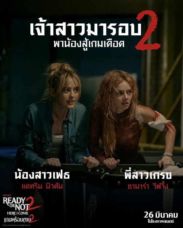 ต้องบอกว่าสะใจแพ็คคู่! ใครเคยเอาใจช่วยเกรซ เจ้าสาวเลือดสาดจาก Ready or Not เมื่อปี 2019 มาวันนี้ความลุ้นระทึกเพิ่มขึ้นแบบคูณสอง เมื่อ “Ready or Not: Here I Come เกมพร้อมตาย 2” กลับมาพร้อมเกมใหม่ ใหญ่กว่า ระทึกกว่า ยกผู้ล่ามาถึง 4 ตระกูล พร้อมพา “เฟธ” น้องสาวต่างแม่ที่ห่างเหินของเกรซ มาแท็กทีมฝั่งเหยื่อ หนีการไล่เชือดสุดหฤโหด พร้อมพลิกเกมเอาตัวรอดแบบแสบสัน ยกระดับทุกความมันส์ให้เข้มข้นกว่าเดิม ในโรงภาพยนตร์ทั่วประเทศ