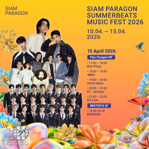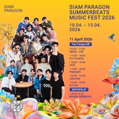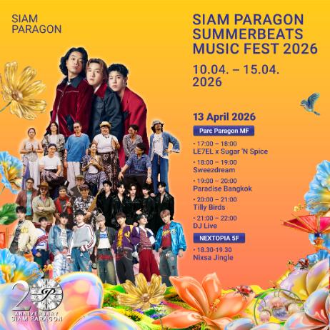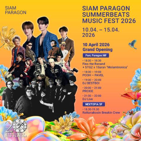 ร่วมขยับบีทความมันส์ของซัมเมอร์ไปกับ “SIAM PARAGON SUMMERBEATS MUSIC FEST 2026” ที่จะพาคุณปล่อยใจไปกับทุกจังหวะดนตรีและเอเนอร์จี้ของเฟสติวัลแบบจัดเต็มตลอดทั้งงานระหว่างวันที่ 10 – 15 เมษายน 2569 นี้ ณ พาร์คพารากอน ชั้น M และเต็มอิ่มกับกิจกรรมมหาสงกรานต์แบบรักษ์โลกได้ที่ NEXTOPIA ชั้น 5 สยามพารากอน ติดตามรายละเอียดเพิ่มเติมได้ที่ Facebook และ Instagram: Siam Paragon