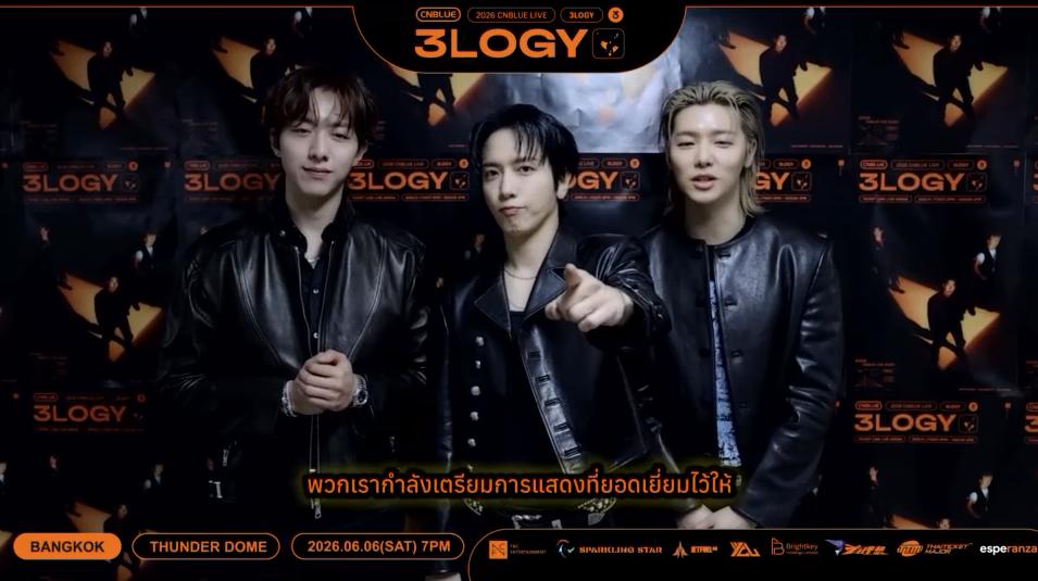 “สวัสดีครับ พวกเรา CNBLUE ครับ! เหล่า Boice กรุงเทพฯ ครับ พวกเรา CNBLUE จะไปพบกับทุกคนในคอนเสิร์ต 2026 CNBLUE LIVE WORLD TOUR ‘3LOGY’ IN BANGKOK ที่กรุงเทพฯ ครับ! ใช่ครับ เหมือนไม่ได้เจอ Boice ชาวไทยมานานเลยนะครับ คอนเสิร์ตครั้งนี้จะจัดขึ้นในวันเสาร์ที่ 6 มิถุนายน ที่ธันเดอร์โดมครับ พวกเรากำลังเตรียมการแสดงที่ยอดเยี่ยมไว้ให้ ดังนั้นขอให้ Boice ทุกคนช่วยรอกันอีกนิดนะครับ พวกเรา CNBLUE ครับ! ขอบคุณครับ”