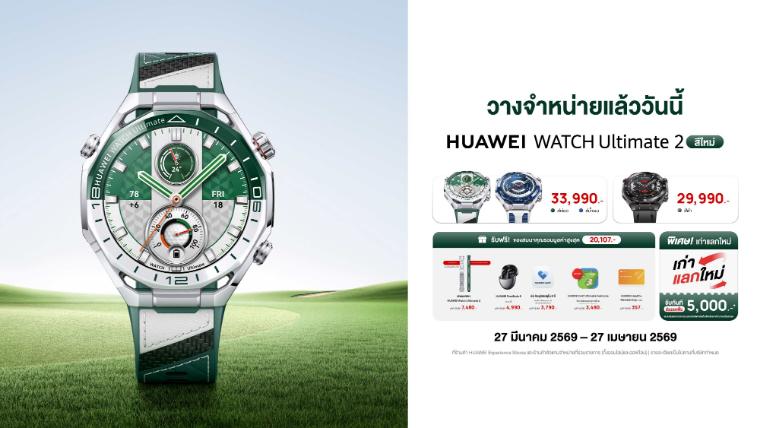 HUAWEI WATCH Ultimate 2 วางจำหน่ายในสีเขียว (สีใหม่) และสีน้ำเงิน ราคา 33,990 บาท ส่วนสีดำราคา 29,990 บาท พร้อมรับของสมนาคุณสุดคุ้มรวมมูลค่าสูงสุด 20,107 บาทเมื่อเป็นเจ้าของระหว่างวันที่27 มีนาคม 2569 ถึงวันที่ 27 เมษายน 2569ได้แก่ สายนาฬิกาเสริม HUAWEI Watch Ultimate 2 มูลค่าสูงสุด 7,480 บาท, HUAWEI FreeBuds 6 (เฉพาะรุ่นที่กำหนด) มูลค่าสูงสุด 4,990 บาท, ประกันอุบัติเหตุ 2 ปี HUAWEI Care+ มูลค่าสูงสุด 3,790 บาท, HUAWEI Golf Ultimate Features (เปิดใช้งานฟรีตลอดชีพ) มูลค่าสูงสุด 3,490 บาท และ HUAWEI Health+ Membership มูลค่าสูงสุด 357 บาท พร้อมข้อเสนอพิเศษ เก่าแลกใหม่ รับส่วนลดเพิ่มทันที 5,000 บาท สามารถสั่งซื้อได้ที่หน้าร้าน HUAWEI Experience Store ร้านค้าตัวแทนจำหน่ายที่ร่วมรายการ และช่องทางออนไลน์อย่าง HUAWEI Store, Lazada, Shopee และ TikTok Shop