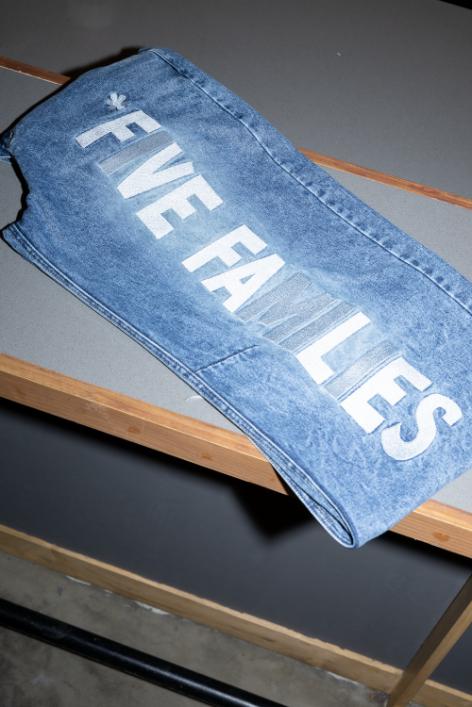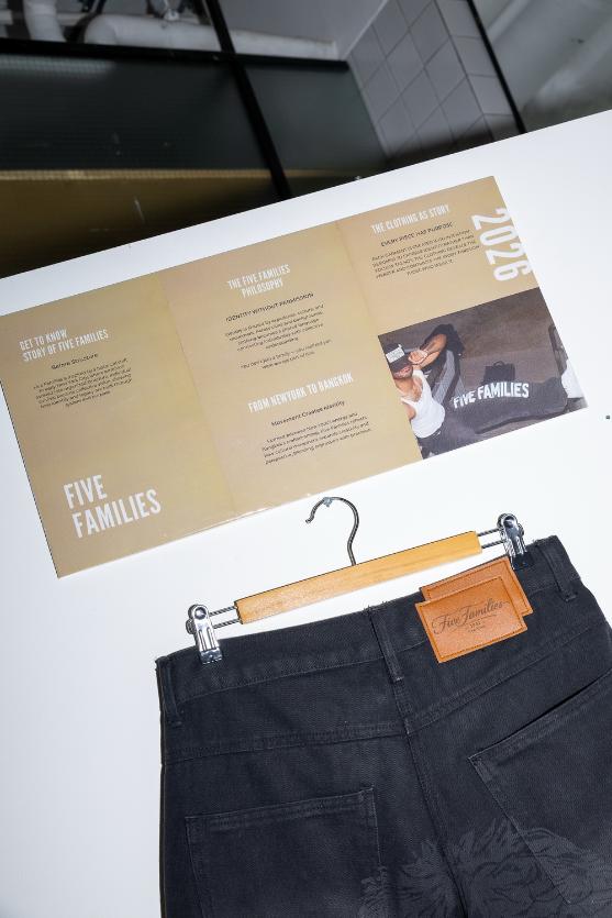 นิทรรศการนี้เป็นการแสดงผลงานครั้งแรกของศิลปินนิวยอร์กที่ตัดเย็บกางเกงยีนส์ จากวัฒนธรรมชีวิตและความรัก ภายในงานนำเอา live Making ในส่วนของการตัดเย็บ มีการนำจักรมาแสดงจริงโดยช่างที่ยากจะได้เห็นวิธีการแบบนี้อีก สำหรับงานแสดงที่กรุงเทพฯนี้ ต้องการให้เห็นถึงจังหวะที่ขับเคลื่อนด้วยงานฝีมือ ความประณีต และการร่วมมือกัน ที่กรุงเทพฯ เสื้อผ้ากลายเป็นมากกว่าการแสดงออก เพราะ Five Families ถือกำเนิดขึ้นจาก “การเคลื่อนไหว” ทุกองค์ประกอบถูกสร้างขึ้นอย่างตั้งใจ การตัดเย็บที่ได้แรงบันดาลใจจากประสบการณ์จริงบนท้องถนน วัสดุที่เลือกเพื่อความยั่งยืน มากกว่าความโดดเด่นเพียงชั่วคราว กราฟิกที่ถูกออกแบบให้เป็น “สัญลักษณ์” ไม่ใช่แค่การตกแต่ง โครงสร้างที่เน้น “การมีตัวตน” มากกว่าการผลิตจำนวนมาก ชิ้นงานของ Five Families ไม่ได้ถูกสร้างมาเพื่อกำหนดตัวตนของผู้สวมใส่แต่มัน “เปิดเผย” ตัวตนของพวกเขา