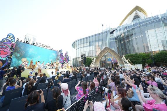 อีกหนึ่งโมเมนต์ที่เรียกเสียงกรี๊ดสนั่น คือการปรากฏตัวของคู่จิ้นสุดฮอต “ซี-นุนิว” ที่ขึ้นเวทีร่วมโชว์เปิดงานในชุดการแสดง “เพลงมงเท่งมง สงกรานต์ดีใจ” ถ่ายทอดเสน่ห์ของเทศกาลสงกรานต์ผ่านศิลปวัฒนธรรมไทยที่ถูกนำมาตีความใหม่อย่างร่วมสมัย โดยเปิดตัวอย่างทรงพลังด้วยการแสดงรวมกลองไทยที่สะท้อนถึงความกล้าหาญและความเข้มแข็ง ก่อนที่ “ซี-นุนิว” จะปรากฏกายในลุคสง่างามผสมผสานดีไซน์ร่วมสมัยเข้ากับความเป็นไทยได้อย่างโดดเด่น ร่วมตีกลอง สร้างภาพจำสุดตื่นตาให้กับผู้ชม ท่ามกลางเสียงและจังหวะที่กึกก้องหนักแน่น เปรียบเสมือนพลังแห่งการเริ่มต้นสิ่งใหม่ที่ยิ่งใหญ่ของปีนี้ จากนั้นในช่วงท้ายโชว์ทั้งคู่ยังร่วมสร้างสีสันด้วยการนำทีมนักแสดงออกสเต็ปเต้นส่งท้ายอย่างสวยงามพร้อมความสนุกสนาน สะกดทุกสายตาได้อย่างอยู่หมัด