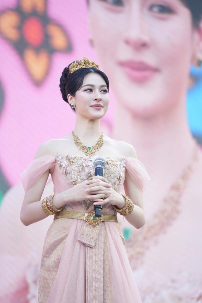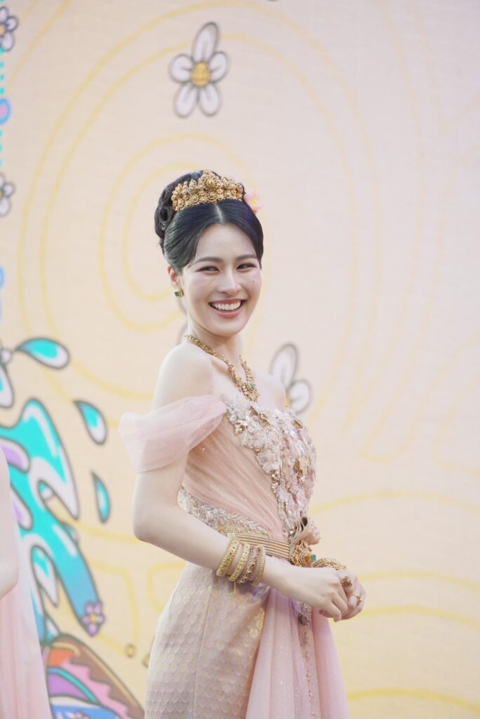 โดย “หลิงหลิง” มาในลุคสง่างามถ่ายทอดความงดงามแห่งราชนารีของสยาม งานปักดิ้นทอง และคริสตัลล้ำค่า ทัดดอกบัวหลวงสีชมพู สะกดสายตาด้วยเครื่องทองคำไทยโบราณแท้ล้ำค่ามูลค่ามหาศาล ที่ขับเน้นความงามสง่าของนางสงกรานต์ได้อย่างสมบูรณ์แบบ โดยสวมมงกุฎทองคำแท้โบราณน้ำหนัก 15 บาท ประดับอัญมณีสามสี คือ เพชรซีก มรกต และทับทิม สร้อยทองคำแท้โบราณ อายุเกือบร้อยปี ประดับเพชรซีก ตรงกลางฝังมรกตโคลัมเบียน้ำหนัก 9 กะรัต ต่างหูทองคำโบราณประดับอัญมณีสามสี ทำเป็นทรงระย้า 3 ชั้น ฝีมือช่างทองหลวง เข็มขัดทองคำโบราณอายุเกือบ 100 ปี สายเข็มขัดทำด้วยทองคำน้ำหนัก 30 บาท ถักเป็นลายทางมะพร้าวซึ่งเป็นเทคนิคพิเศษของช่างทองโบราณ หัวเข็มขัดทำด้วยทองคำฝังเพชรซีก ตรงกลางฝังมรกตโคลัมเบียน้ำงาม น้ำหนัก 11 กะรัต กำไลข้อมือคู่ที่ 1 เป็นกำไลข้อมือทองคำโบราณ ลงยาราชาวดี ประดับเพชรซีกและทับทิมสยาม กำไลข้อมือคู่ที่ 2 เป็นกำไลข้อมือทองคำโบราณฉลุลายเถาวัลย์และดอกไม้ที่มีความอ่อนช้อย ฝังเพชรซีกน้ำดี กำไลข้อมือคู่ที่ 3 เป็นกำไลข้อมือทองคำโบราณฝังเพชรซีก 3 แถว