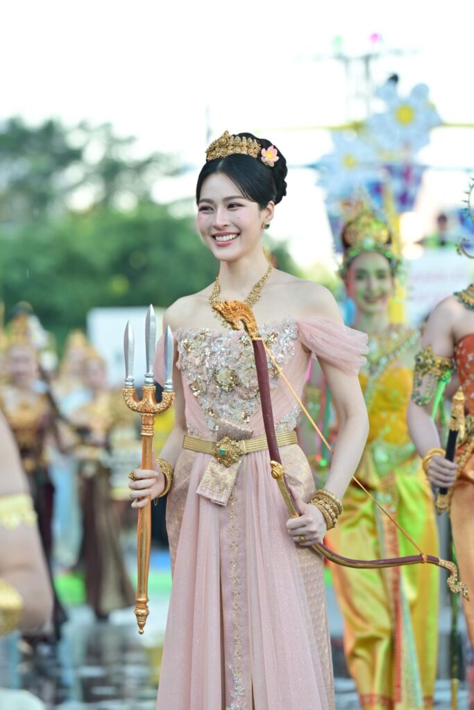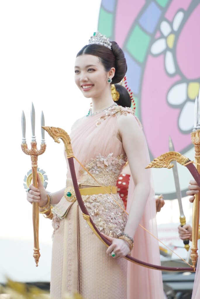 ทันทีที่ขบวนนางสงกรานต์เคลื่อนเข้าสู่ริเวอร์ พาร์ค ไอคอนสยาม ก็สร้างความตื่นตาตื่นใจให้กับทุกคนภายในงาน ด้วยความอลังการของขบวนที่วิจิตรงดงามทุกรายละเอียด โดยเฉพาะนางสงกรานต์ “หลิง–ออม” ที่ปรากฏโฉมความงดงามเป็นนางสงกรานต์ประจำวันอังคาร “นางรากษสเทวี” ซึ่งความพิเศษอยู่ที่การตีความนางสงกรานต์ให้มีชีวิตชีวาและเข้าถึงคนรุ่นใหม่ ผ่านงานออกแบบเครื่องแต่งกายสุดประณีตโดย ครูบิ๊ก พีรมณฑ์ ชมธวัช แห่งอาภรณ์งามสตูดิโอ ที่นำแรงบันดาลใจจากชุดไทยพระราชนิยมมาตีความใหม่ในโทนสีชมพูออยล์อ่อนหวาน ผสานความพลิ้วไหวของผ้าตาข่ายและผ้ายกทองลวดลายโบราณ ไม่ว่าจะเป็นลายกนกเครือเถาและลวดลายประยุกต์ที่สื่อถึงความรุ่งเรืองและการเจริญงอกงาม ผสานวัสดุร่วมสมัย อาทิ คริสตัล อัญมณี และเทคนิคงานปักชั้นสูง เพื่อเพิ่มมิติแห่งแสงและความวิจิตรตระการตา ศิราภรณ์ได้รับการออกแบบให้มีความสง่างามตามแบบราชสำนักไทย เสริมความเลอค่าด้วยเครื่องประดับทองแท้โบราณหายากของสะสมของ คุณโจ๊ก-พุทธพงษ์ เพียรเจริญ