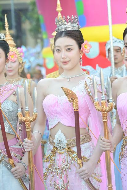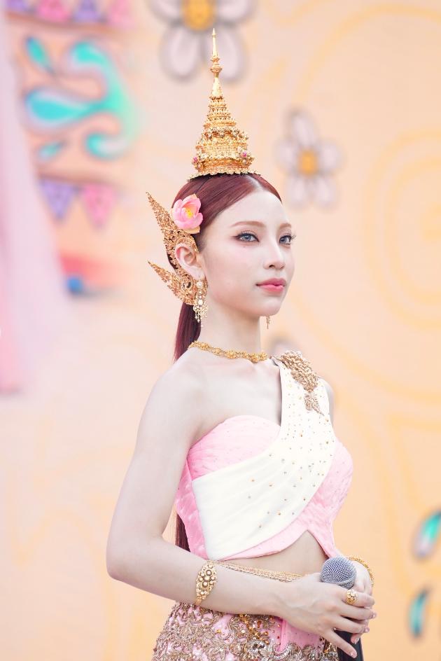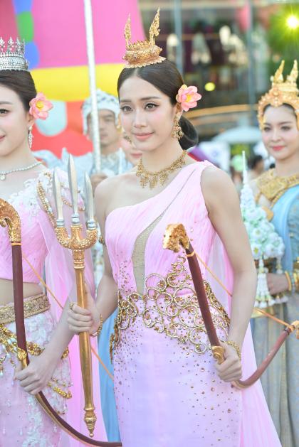 ทำเอาริเวอร์ พาร์ค ไอคอนสยาม เนืองแน่นไปด้วยเหล่าฟอร์อาย รวมถึงประชาชนและนักท่องเที่ยวที่ต่างมารอมารอยลโฉม 7 สาว แฮนน่า, อ๊ะอาย, ตาออม, พั้นช์, ฝ้าย, มายด์ และ โจริญ ซึ่งมาร่วมถ่ายทอดความงดงามของมรดกไทยในฐานะนางสงกรานต์ประจำปี 2569 “รากษสเทวี” ในขบวนแห่ฉลองวันสงกรานต์ โดยงานนี้ทั้ง 7 สาวสลัดลุคเกิร์ลกรุ๊ปสุดแซบ มาปรากฏกายในชุดเทพนารีสุดวิจิตร ผลงานชุดนี้ออกแบบโดย ดร.สุรัตน์ จงดา แห่งคณะไก่แก้วการละคร ผู้รังสรรค์ศิลป์เครื่องแต่งกายไทยร่วมสมัยชั้นนำของประเทศไทย ด้วยประสบการณ์และความเชี่ยวชาญด้านศิลปะการแสดงและเครื่องแต่งกายไทย ได้รับรางวัลการออกแบบเครื่องแต่งกายรางวัลนาฏราช ซีรีส์ เรื่องแม่หยัว และดร.เจษฏากรณ์ เอี่ยมอุไร ห้องเสื้อรามลักษณ์ เคยออกแบบชุดประจำชาติเวทีมิสแกรนด์ ได้ถ่ายทอดความงดงามทางวัฒนธรรมผ่านผลงานที่วิจิตรตระการตาทรงคุณค่า โดยออกแบบชุดนางสงกรานต์ภายใต้คอนเซปต์ชุดไทยประยุกต์ตัดเย็บแบบ Haute Couture ในโทนสีชมพูออยล์ (Pink Oil) ผสานผ้ายกทองลวดลายโบราณและเครื่องประดับล้ำค่า โดดเด่นเป็นสง่าท่ามกลางขบวนแห่นางสงกรานต์สุดอลังการ ที่ผสานความขลังของคติความเชื่อไทยเข้ากับพลังของศิลปินยุคใหม่ได้อย่างลงตัว