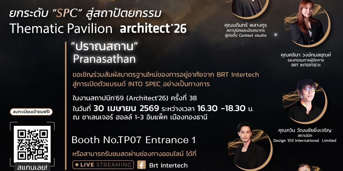 บริษัท บีอาร์ที อินเตอร์เทค จำกัด ตอกย้ำผู้นำนวัตกรรมวัสดุทดแทนไม้ เปิดตัวแบรนด์ “INTO SPEC” อย่างยิ่งใหญ่ พร้อมชูไฮไลท์ “ประตู SPC” ผสานเทคโนโลยี Sanitized® จากสวิตเซอร์แลนด์ คุณสมบัติยับยั้งแบคทีเรียและไวรัสได้ถึง 99% ในงาน สถาปนิก’69 (Architect’26) ครั้งที่ 38 วันที่ 30 เมษายนนี้ เวลา 16.30 น. ณ เลขที่บูธ TP07 ระหว่างเสาที่ 39–40 ฮอลล์ชาเลนเจอร์ 3 ประตู 1 อิมแพ็ค เมืองทองธานี