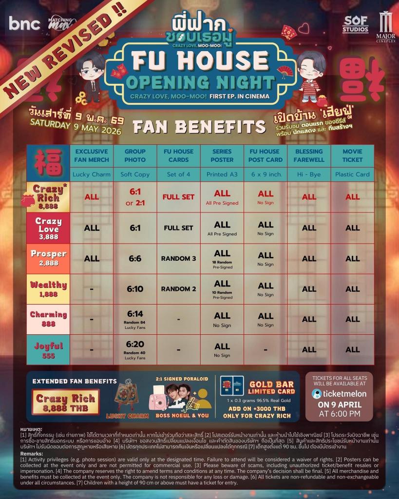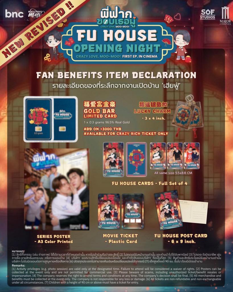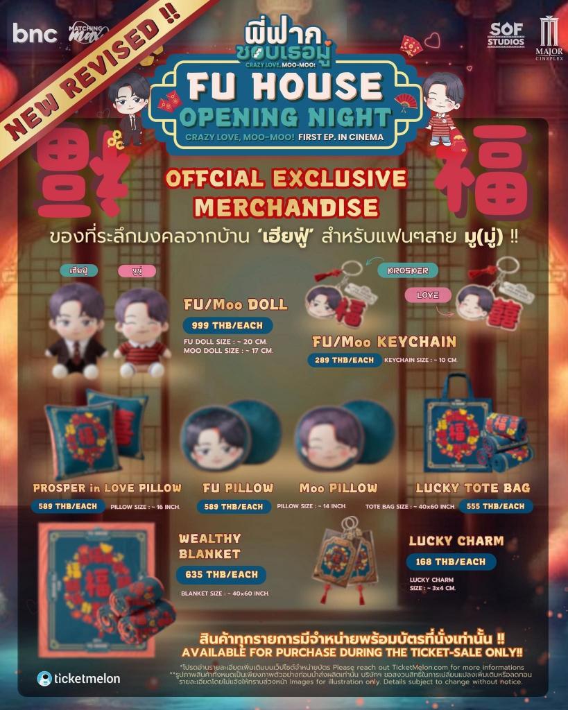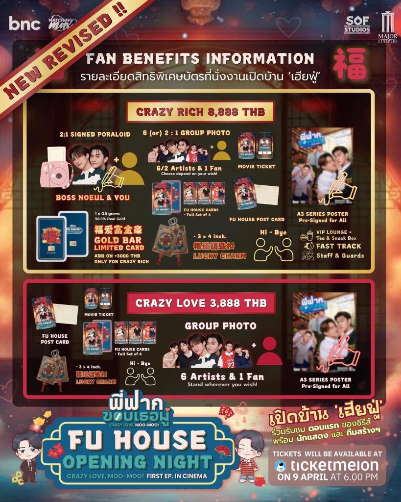 สำหรับผู้ที่สนใจร่วมงาน “Fu House Opening Night” สามารถจองบัตรได้แล้ววันนี้ จำหน่ายบัตรผ่านทาง Ticketmelon บัตรราคา 8,888 บาท / 3,888 บาท / 2,888 บาท / 1,888 บาท / 888 บาท / 555 บาท พร้อมรับ Merchandise มงคลสุดพิเศษ! เฉพาะผู้ถือบัตรเท่านั้นและมีจำนวนจำกัด “ไม่มีผลิตเพิ่ม” อีกแล้ว บอกเลยว่านี่ไม่ใช่แค่ของที่ระลึก แต่คือ “โมเมนต์ครั้งแรก” ของซีรีส์ที่คุณจะได้เก็บไว้ตลอดไป พร้อมแล้วไปจองบัตรกันได้เลย!