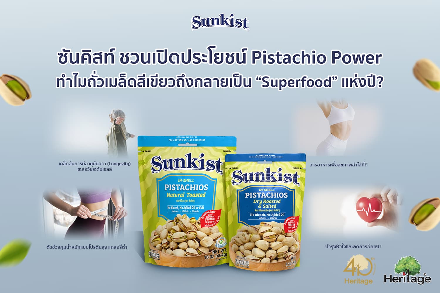 เพื่อให้การดูแลสุขภาพเป็นเรื่องง่าย อร่อย และได้ประโยชน์มากมาย ด้วยเหตุผลที่กล่าวมาในเบื้องต้น “ซันคิสท์” ผลิตภัณฑ์ถั่วพิสทาชิโอและถั่วพรีเมียมภายใต้การดูแลของเครือเฮอริเทจ จึงได้คัดสรรถั่วพิสทาชิโอคุณภาพเยี่ยมจากแคลิฟอร์เนียมาให้คุณได้เลือกสรรหลากหลายรสชาติ ได้แก่ ซันคิสท์ พิสทาชิโออบ, ซันคิสท์ พิสทาชิโออบเกลือ, ซันคิสท์ พิสทาชิโอรสฮอต & สไปซี่, ซันคิสท์ พิสทาชิโออบเกลือรสพริกไทยดำ เป็นต้น หาซื้อได้แล้ววันนี้ที่ร้านค้าชั้นนำทั่วประเทศ และ ช่องทางออนไลน์ LINE Official: @heritagethailand