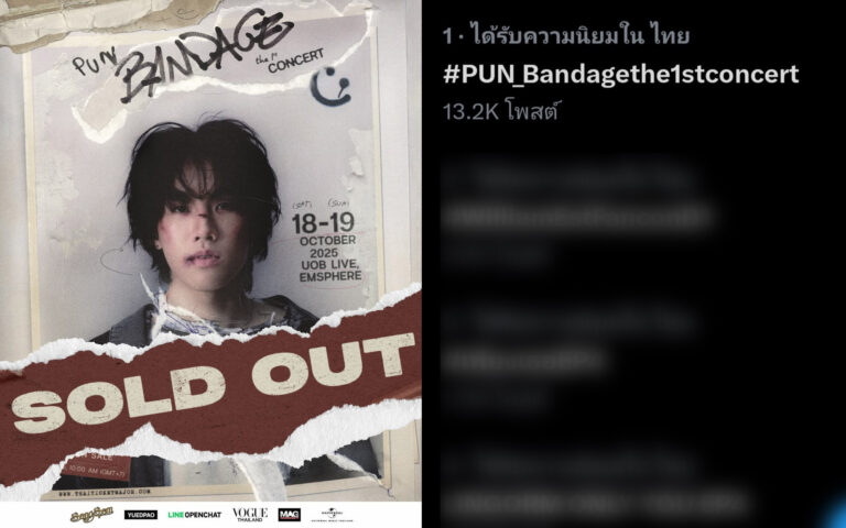 ปรากฏการณ์ครั้งใหญ่ของศิลปินหนุ่มมาแรง PUN กับคอนเสิร์ตเดี่ยวครั้งแรกในชื่อ “PUN ‘Bandage’ – The 1st Concert” สร้างประวัติศาสตร์ Sold Out ทันทีทั้ง 2 รอบ ขายบัตรไปได้รวมกว่า 10,000 ใบ หมดเกลี้ยงภายในเวลาเพียง 30 นาทีหลังเปิดขาย ความแรงยังไม่หยุด เมื่อ #PUN_Bandagethe1stconcert พุ่งติดอันดับ 1 Trending ใน X ภายใน 1 ชั่วโมงต่อมา ยืนยันว่านี่คือคอนเสิร์ตที่แฟน ๆ ห้ามพลาดเด็ดขาด พร้อมการันตีแล้วว่า PUN คือศิลปินสุดฮอตแห่งปี 2025 ทั้งนี้…