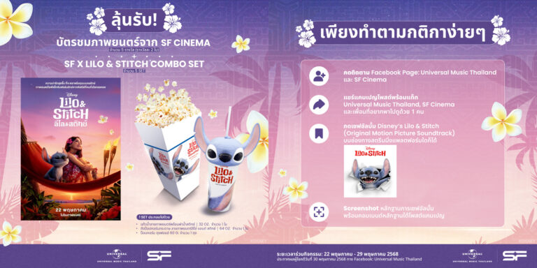 ใครเป็นสาวก Disney และแฟนตัวยงของ Lilo & Stitch อย่าพลาดกับกิจกรรมสนุก ๆ จาก Universal Music Thailand ลุ้นรับฟรี! บัตรชมภาพยนตร์จาก SF Cinema (จำนวน 5 รางวัล รางวัลละ 2 ใบ) + SF x LILO & STITCH COMBO SET (จำนวน 5 เซ็ต) ตั้งแต่วันนี้ถึง 29 พฤษภาคม 2568 รายละเอียดติดตามได้ที่นี่ https://www.facebook.com/100064382755801/posts/1139347701554644/?mibextid=wwXIfr&rdid=ce8KCmjYYYtEcAU7# สตรีมอัลบั้มเพลงประกอบ…