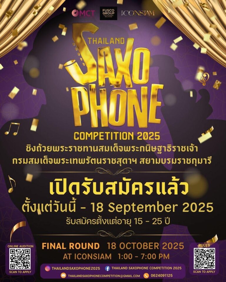 สายสม วงศาสุลักษณ์ ผู้รับใบอนุญาต โรงเรียนเฉลิมพระเกียรติ ๔๘ พรรษา ในพระราชูปถัมภ์ฯ พร้อมด้วย ภชกรณ์ กาญจนมงคล ประธานเจ้าหน้าที่บริหาร บริษัท ฟุสโก กรุ๊ป ร่วมกับ ศูนย์การค้าไอคอนสยาม (ICONSIAM) จัดการแข่งขัน “Thailand Saxophone Competition 2025” ชิงถ้วยพระราชทาน สมเด็จพระกนิษฐาธิราชเจ้า กรมสมเด็จพระเทพรัตนราชสุดาฯ สยามบรมราชกุมารี เพื่อสร้างแรงบันดาลใจให้เยาวชนของไทย ร่วมอนุรักษ์คุณค่าของศิลปวัฒนธรรมทางดนตรี โดยรอบตัดสินจะจัดขึ้นใน วันเสาร์ที่ 18 ตุลาคม 2568 เวลา 13.00 น. ณ ชั้น 8 ศูนย์การค้าไอคอนสยาม…