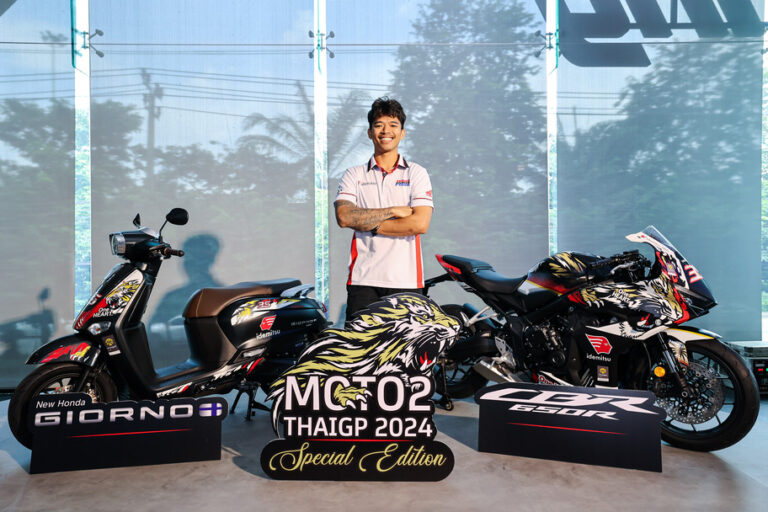 ไทยฮอนด้า เอาใจแฟนพันธุ์แท้มอเตอร์สปอร์ต เปิดตัวรถลายพิเศษ 2 รุ่น ได้แก่ “New Honda Giorno+ Moto2 ThaiGP 2024 Limited Edition” ผลิตจำนวนจำกัดเพียง 35 คันในโลกเท่านั้น และ “Honda CBR650R Moto2 ThaiGP 2024 Special Edition” โดยได้นำเสนอลวดลายที่สะท้อนจากรถแข่งที่ “ก้อง-สมเกียรติ จันทรา” จะใช้ลงแข่งล่าแชมป์ในไทยจีพี 2024 นี้ โดยได้แรงบันดาลใจของ “ก้อง-สมเกียรติ” ถ่ายทอดลงบนตัวรถให้แฟนพันธุ์แท้ได้มีโอกาสเป็นเจ้าของในแบบลิมิเต็ดขั้นสุด เปิดรับจองเฉพาะในงานไทยจีพี 2024 นี้เท่านั้น สำหรับรถลายพิเศษ “พยัคฆ์คำราม” ได้รับการออกแบบโดยดีไซน์เนอร์จาก Honda R&D Southeast Asia ซึ่งมุ่งเน้นถ่ายทอดเอกลักษณ์และตัวตนของก้องออกมาผ่านการใช้รูปเสือ ซึ่งเป็นปีนักษัตรของก้อง…