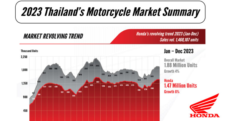ไทยฮอนด้า ผู้ผลิตและจัดจำหน่ายรถจักรยานยนต์ และเครื่องยนต์อเนกประสงค์ฮอนด้าในประเทศไทย เปิดเผยยอดจำหน่ายรถจักรยานยนต์ฮอนด้าปี 2023 ภาพรวมตลาดแตะระดับ 1.88 ล้านคัน ฮอนด้าคว้ายอดจดทะเบียนสูงสุดที่ 1.47 ล้านคัน ครองอันดับที่ 1 ติดต่อกันเป็นปีที่ 35 พร้อมคว้ายอดจดทะเบียนสูงสุด 5 อันดับแรก ตอกย้ำความสำเร็จจากผลิตภัณฑ์ที่ตอบโจทย์การใช้ชีวิตของลูกค้าทุกกลุ่ม ทุกไลฟ์สไตล์ มร.ชิเกโตะ คิมูระ ประธานกรรมการบริหาร บริษัท ไทยฮอนด้า จำกัด กล่าวว่า “ภาพรวมตลาดรถจักรยานยนต์ไทยปี 2023 มีแนวโน้มที่ดี โดยตลาดรวมมียอดจดทะเบียนอยู่ที่ 1.88 ล้านคัน เติบโตขึ้นจากปีที่ผ่านมา 4% โดยกลุ่มรถเอ.ที. ได้รับความนิยมสูงที่สุดมีส่วนแบ่งการตลาดอยู่ที่ 49% เพิ่มขึ้นจากปีที่แล้ว 5% ถือเป็นกลุ่มที่มีแนวโน้มเติบโตขึ้นเรื่อยๆ เนื่องจากพฤติกรรมของผู้บริโภคที่เปลี่ยนแปลงไปจากการใช้งานที่สะดวกสบาย…