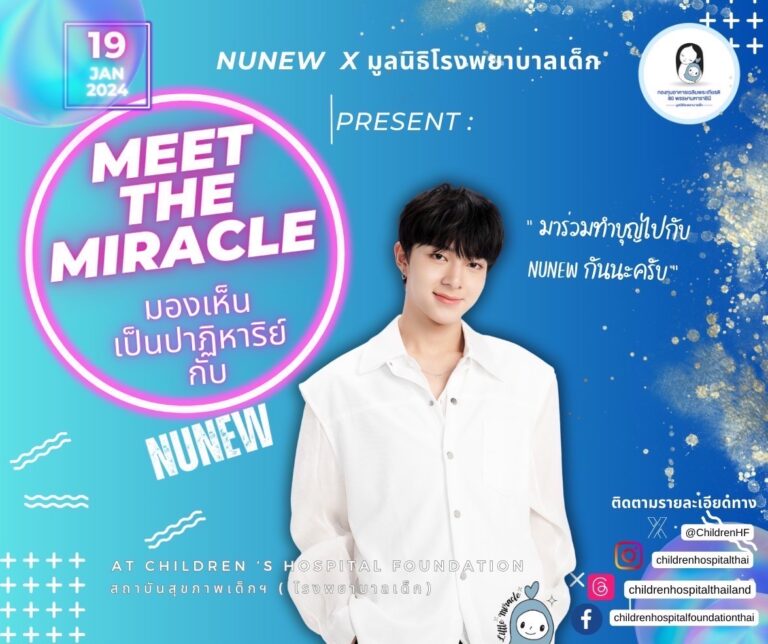มูลนิธิโรงพยาบาลเด็ก กองทุนอาคารเฉลิมพระเกียรติฯ ส่งต่อความสุขด้วยกิจกรรมดีๆ ส่งท้ายปี กับ “Meet The Miracle มองเห็นเป็นปาฏิหาริย์ ช่วยน้องให้มองเห็น ลดอัตราการตาบอดในเด็กไทย” จับมือ NuNew ศิลปินหนุ่มหล่อเสียงละมุน “นุนิว ชวรินทร์ เพริศพิริยะวงศ์” ดีกรีความฮอตปรอทแตก!! แฟนคลับคลั่งรักสุดในหลายๆ ประเทศทั่วโลก อาสาร่วมเป็นสะพานบุญให้ผู้มีจิตศรัทธาได้ร่วมบุญใหญ่รับปีใหม่ 2567 Meet&กรี๊ด สุดพิเศษ!! โดยกิจกรรมจะจัดขึ้นในวันศุกร์ที่ 19 มกราคม 2567 ณ มูลนิธิโรงพยาบาลเด็ก ถ.ราชวิถี กิจกรรมครั้งนี้เปิดโอกาสให้ทุกคน และแฟนคลับนุนิว ร่วมเป็นสะพานบุญส่งมอบของขวัญที่ดีที่สุด คือการมองเห็น เพื่อสนับสนุนโครงการช่วยน้องให้มองเห็น ช่วยเหลือน้องๆ ผู้ป่วยเด็กได้มีโอกาสมองเห็น ซึ่งมูลนิธิโรงพยาบาลเด็ก กองทุนอาคารเฉลิมพระเกียรติฯ…